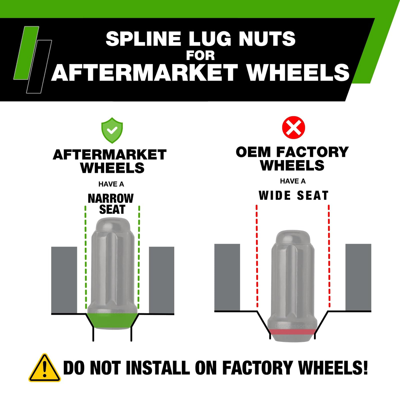 Q: What tools are required for installation and removal of these lug nuts?A: You will need a 13/16 inch (21mm) and a 22mm hex spline tool/key for installation and removal. One spline tool/key is included with the set for your convenience.