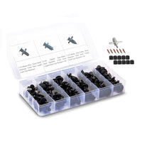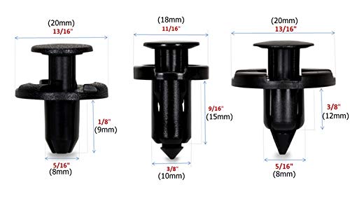 Q: What sizes are included in the Dr.Roc Bumper Clips kit?A: The Dr.Roc Bumper Clips kit includes three different sizes. The clips have hole sizes of 5/16" (8mm), 23/64" (10mm), and various head diameters and stem lengths to fit different applications, including fender liners, bumper covers, and radiator supports.