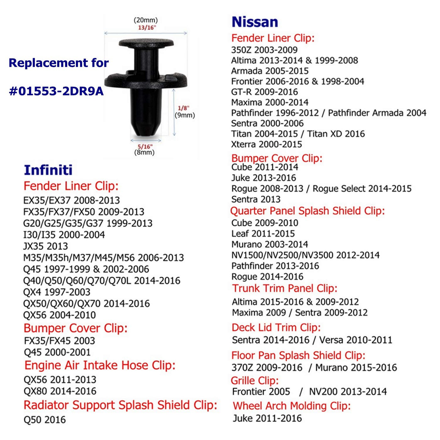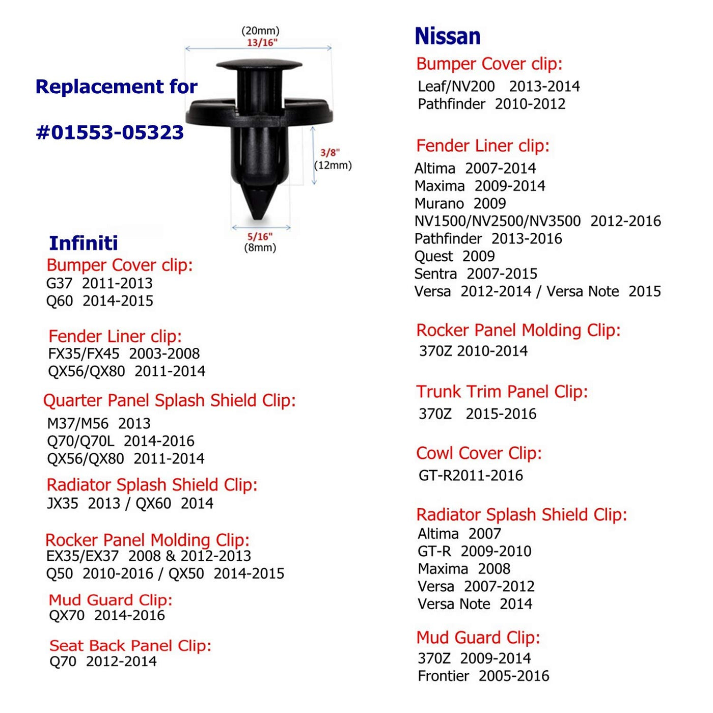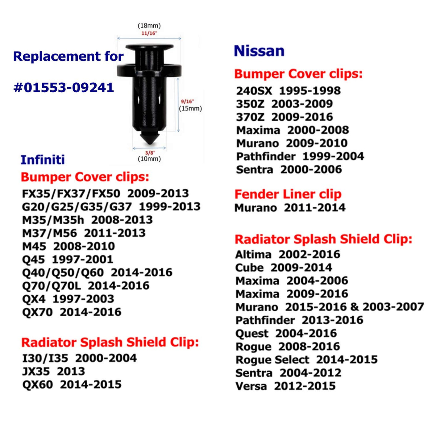 Q: What vehicles are compatible with the Dr.Roc Bumper Clips?A: The Dr.Roc Bumper Clips are compatible with a wide range of Nissan and Infiniti models, including the EX35, G20, G25, G35, G37, M35, M37, Q40, Q45, Q50, Q60, and many more from the years 1997 to 2016. Specific replacements include 01553-09321, 01553-05323, and 01553-09241.