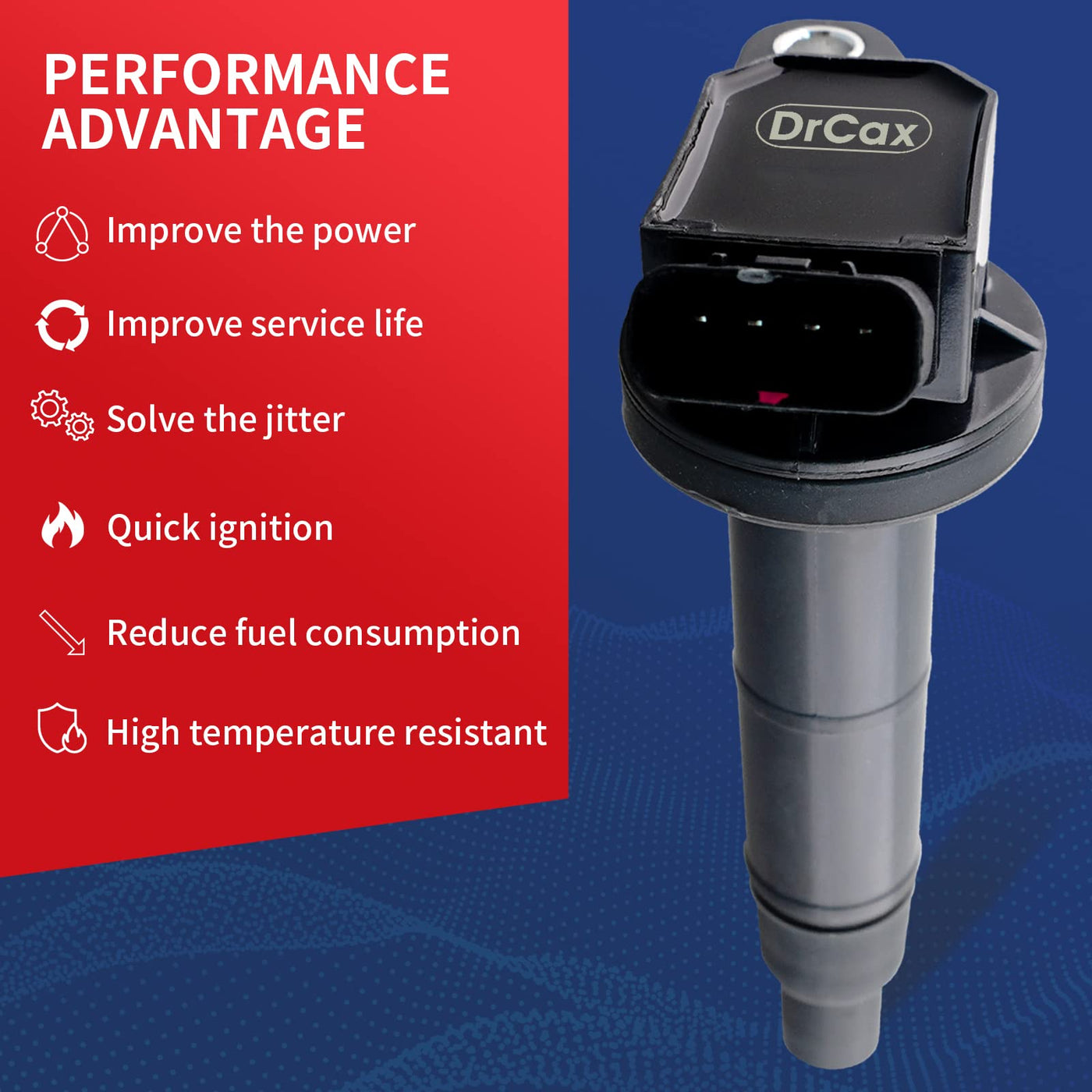 ALL ITEMS ARE BRAND NEW Package Including: 1 x New Ignition Coil Common Symptoms of a Faulty Coil Pack: A rough idle A noticeable lack of power An unexplainably louder-than-usual engine A significant drop in RPMs while accelerating for no apparent reason A blinking or intermittently activating check engine light An active gas warning light when the vehicle has plenty of gasoline Smoke from the exhaust emitting intermittently, instead of in a steady stream If your car has the above symptoms, it is highly recommended to replace the ignition coil in time for your driving safety. Why Choose Our Coils? 100% Factory tested Ready to use, Direct Replacement Built to strict quality control standards Use highest grade material with OE+ durability Durable and reliable under extreme conditions while Provide high Electrical, Corrosion, and Abrasion Resistance Part Numbers: UF333, UF-333, 90919-02243, 90919-02244 C1330, 50083, 90919-02266, 19205387, E363, UF494, UF-494 19185426, IC463, IC465, ADT314111, 5C1299, 9008019023 Applications and Compatability 2010-2012 Lexus H2250h L4 2.4L 2009-2010 Pontiac Vibe L4 2.4L 2005-2010 Scion tC L4 2.4L 2009-2010 Toyota Camry L4 2.4L Hybrid 2006-2008 Toyota Camry L4 2.4L 2002-2005 Toyota Camry L4 2.4L 2009-2010 Toyota Corolla L4 2.4L 2001-2007 Toyota Highlander L4 2.4L 2009-2010 Toyota Matrix L4 2.0L 2001-2003 Toyota Rav4 L4 2.4L 2004-2008 Toyota Rav4 L4 2.4L 2004-2006 Toyota Solara L4 2.4L 2002-2003 Toyota Solara L4 2.4L About Us DrCax are automotive-related brand,supplying mainly high quality auto parts for all over the world.Experienced in OEM service and Tuning parts for years.