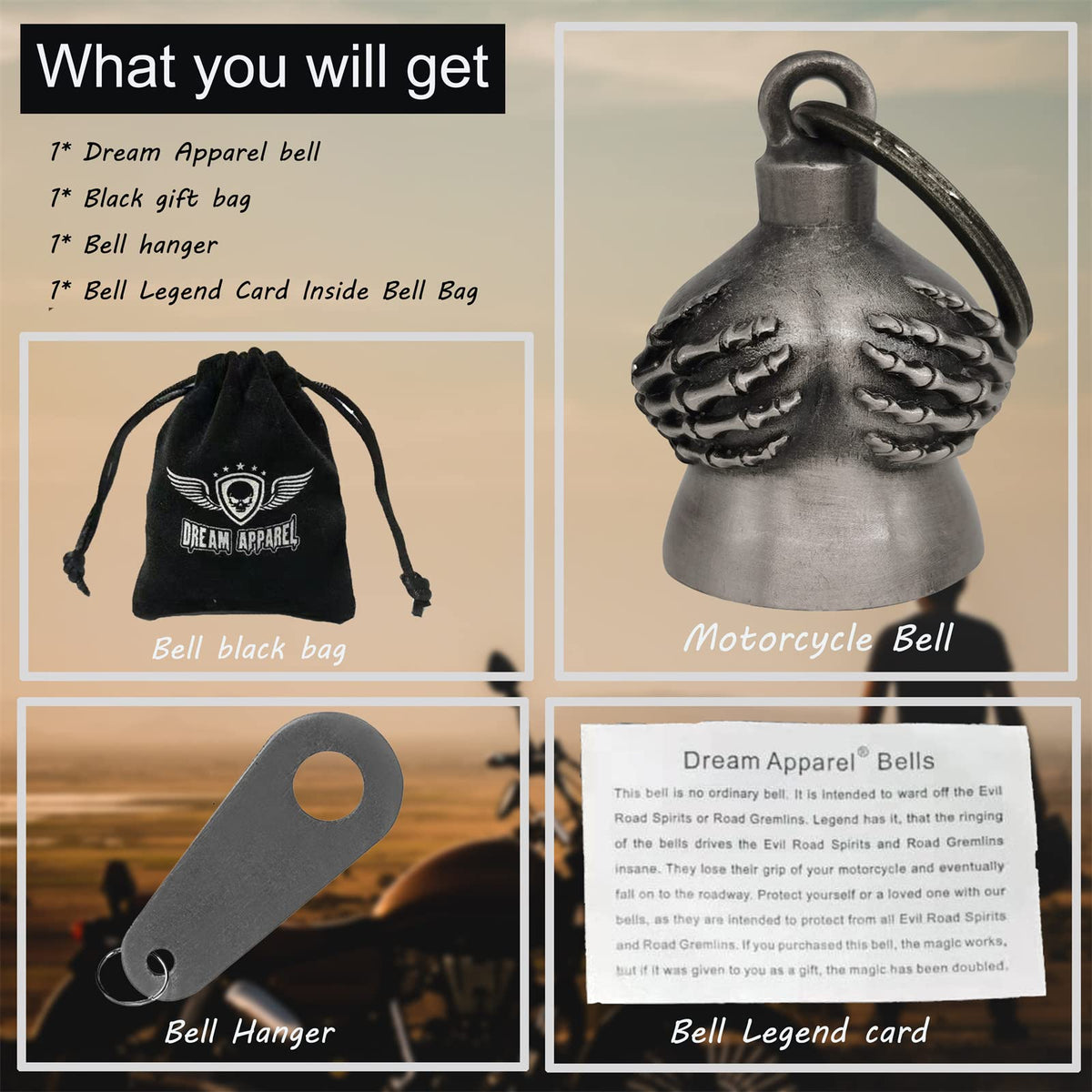 1.Not All Dream Apparel Motorcycle Bells Are Created Equal, Each Design Has It'S Own Meanings And Stories To Keep Riders Safe And Lucky. ,3D Designing Ride Bells Makes It More Fashion And Unique.To The First One To Own The Biker Bells,And Ride Safe!! 2.Each Luck Bell Comes With 1 Hanger+1 Black Gift Bag+1 Legend Of The Dream Apparel Bell Story Card,Measures: 2.75' Tall Ring Include, 1.18'Bottom Wide. And Weight 0.17Lbs,Heavy Motorcycle Bell Keeps More Sturdy While Riding. 3.Dream Apparel Road Bells Are Made By Finest Sterling Magnesium Alloy With Gun Metal Colors , Alloy Is Universally Know For Its Extraordinary Strength And Durability, Which Makes It Perfect For The Motorcycle Life. 4. Dream Apparel Spirit Bell Is A Kind Of Good Luck Charm For Motorcycle Riders.It Is A Way To Ward Off The Spirits,And Protect Riders During Their Travels.If You Purchase This Bell,The Magic Works,But If It Was Given To You As A Gift,The Magic Has Been Doubled. 5.This Ride Bells Are Multi Usage, It Could Be Hang On Motorcycle For Safe And Lucky, Can Hang On Pet Lease ,And Can Be A Keychain .