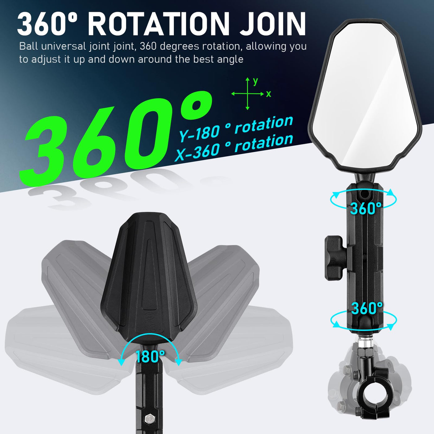Fitment: Compatible with 8/10MM, for most motorcycle, atv, snowmobile, bike, off-road cruiser chopper, etc Feature: Color: black Function: ensuring you have a clear sight of the road behind you Material: ABS+Aluminum Alloy Package Includes:2 x Side View Mirrors; 2 x Clamps for 7/8'' handlebar; 5 x Threaded Mounting Bolts (8MM and 10MM)