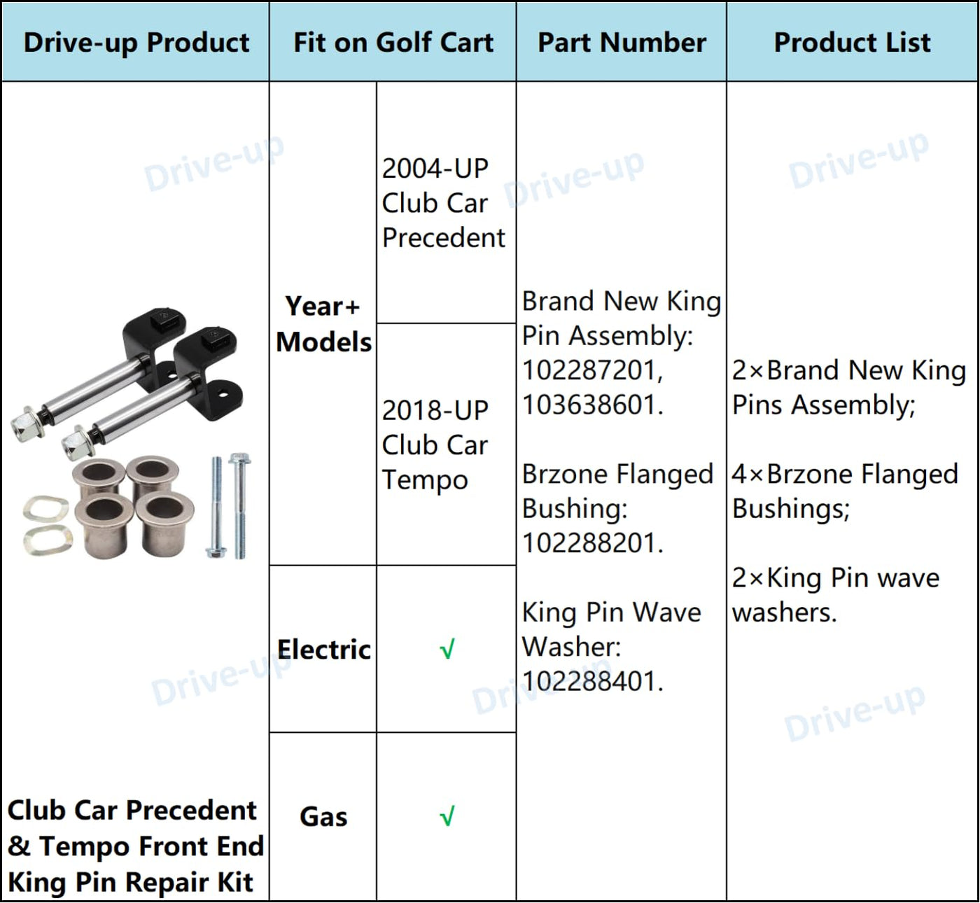 Drive-Up Golf Cart Front End King Pin Repair Kit For Club Car Precedent 2004-Up Gas And Electric Models, Replaces Oem 102287201