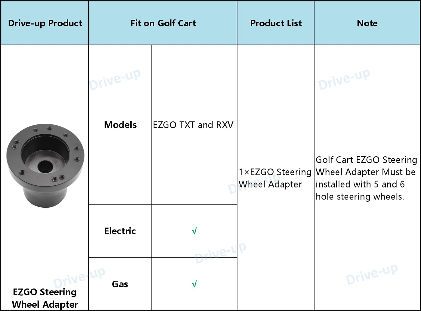 Q: What golf cart models are compatible with the Drive-up Golf Cart Steering Wheel Adapter?A: The Drive-up Golf Cart Steering Wheel Adapter is specifically designed for use with EZGO TXT and EZGO RXV golf cart models.