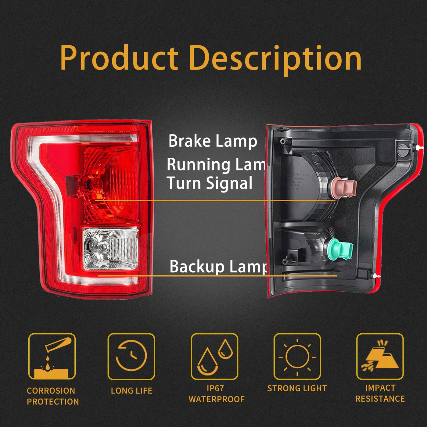 Compatible With 2015-2017 Ford F-150 Note: Please Check The Part Number Before Buying To Make Sure It Fits Your Car Features: Type: Halogen Color:Red &Amp; Clear Lens Tightness : Completely Sealed, Can Still Operate Intact In Time Of Heavy Rain Lenses: Our Injection Molded Polycarbonate Lenses Are Derived From Aerospace Technology And Provide Excellent Uv Protection Against Yellowing And High Impact Resistance. 100% Legal Mirror: High-Reflective Amber Mirror Provides Safety Features That Give The Car An Oem Style And Meet Dot And Sae Standards Package Included: 1 Driver Left Side, 1 Passenger Right Side. Pair Of High Quality Tail Ligh About Us We Are A Serious And Responsible Company, If There Are Any Problems With Our Products, Please Contact Us In Time, We Will Respond Immediately, Thank You For Your Support And Thank You For Your Attention To Our Products Today.