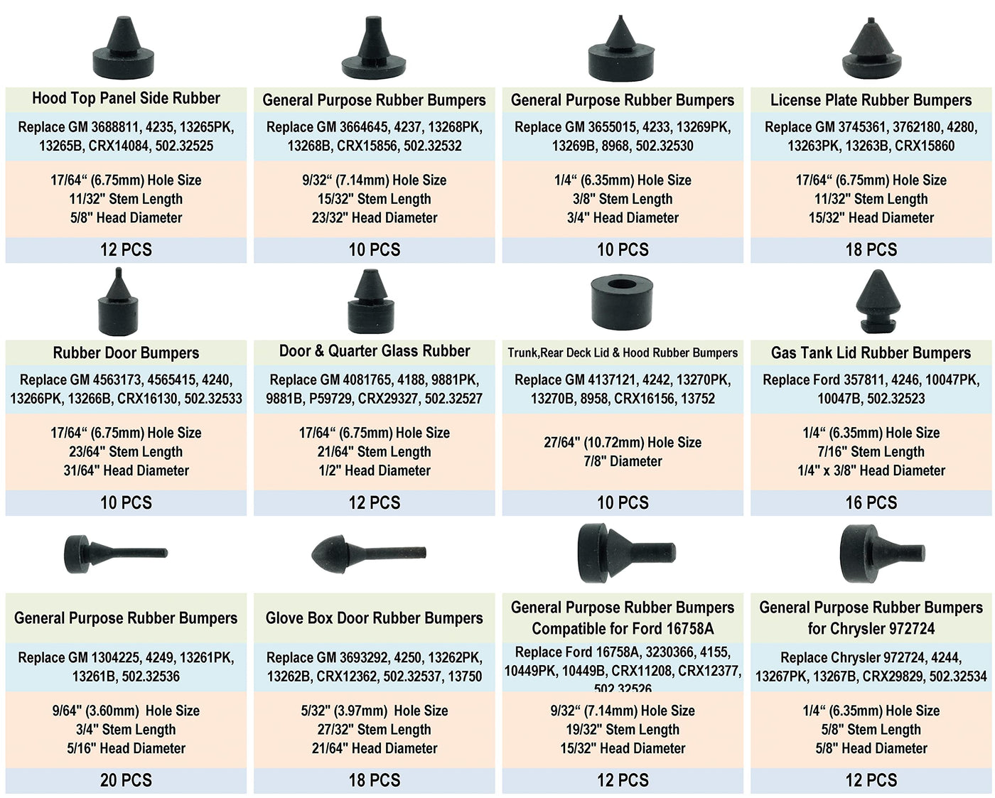 - Q: What types of vehicles are compatible with the Dsnaduo Rubber Bumper Assortment? A: The Dsnaduo Rubber Bumper Assortment is compatible with various automotive brands, including GM, Ford, and Chrysler. It includes specific bumpers for models that replace OEM parts such as GM 3688811, 3655015, and others.