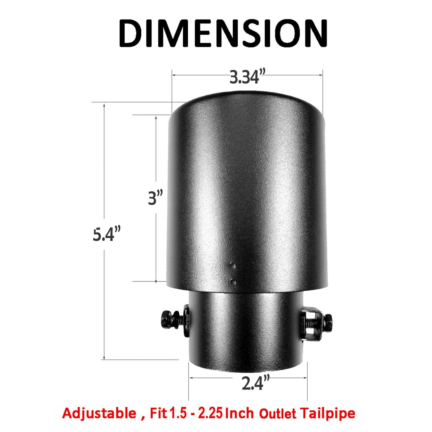 ?Product Dimensions?Adjustable Inlet, Fit all cars that tailpipe outlet diamater is 1.5 - 2.25 inch ( Size: 3.3 inch outlet diameter; Overall Length: 5.4 inch). Rolled edge and oval outlet Design. (Pay attention: This exhaust tip is oval outlet, not round outlet) | ? Protect & Decorate the Original Tailpipe ? Black finish provides a stylish look for your vehicle instead of the rusted old tailpipe,make your vehicle look more expensive. Effective protect the original exhaust pipe from sun and rain, avoid rusting and deformation. | ?Bolt - On Design?Bolt On installation. No welding or drilling is needed, just slide the tip into place on the tailpipe and tighten with a wrench. (Please check the size of tailpipe before purchasing) | ?Measure Your Tailpipe Size?Universal fits for vehicles with 1.5 - 2.25 inch outside diameter exhaust tailpipe, no matter of your Year/Make/Model. Please measure your exhaust pipe outlet size before purchase to make sure vehicle have enough space to install ! | ?Warm Tips?To make Dsycar exhaust tip has a long-life service: Please Sweep away the welding debris, cement, oil, white ash, sand ash regularly to keep the surface clean. We recommend to do above action once a month. Any problem free to contact us.