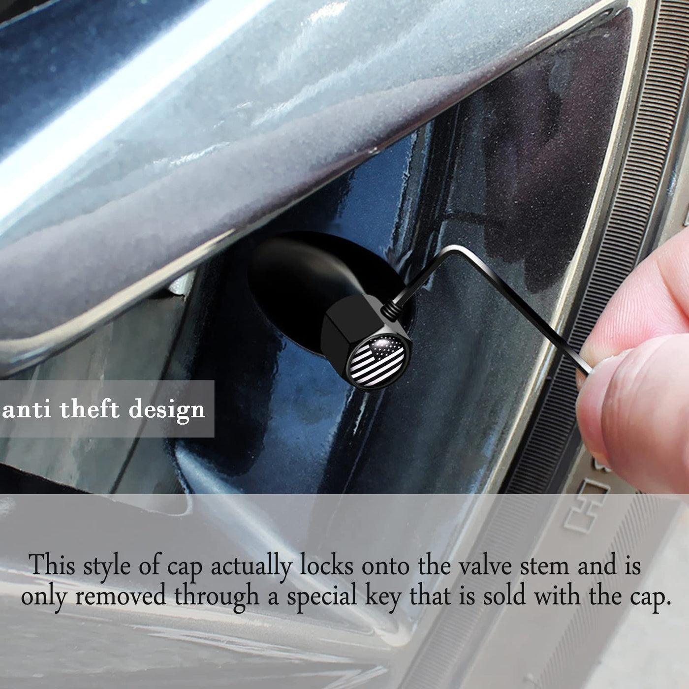 Q: How do the anti-theft features work on these valve caps?A: These valve caps feature an anti-theft design that includes a screw mechanism. By using the included allen wrench, you can securely tighten the caps, preventing them from being easily twisted off or stolen, providing added security for your wheels.