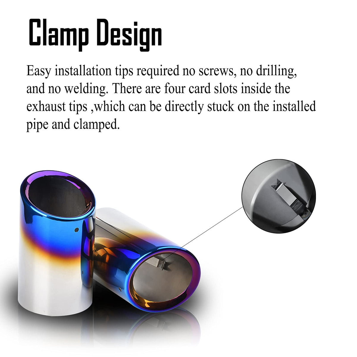 Q: How do I install the exhaust tips?A: Installation is straightforward with the Dsycar exhaust tips. There is no need for welding or drilling. The tips come with 4 buckles that make the installation easy, fitting vehicles with a 2.5-inch outside diameter exhaust tailpipe.