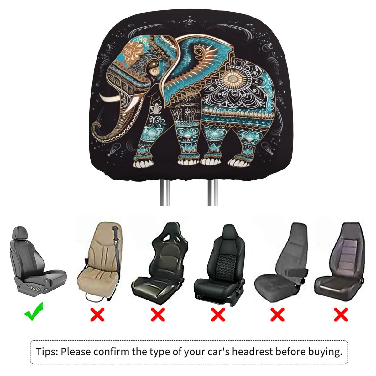 Dujiea 2 Pack Mandala Tribe Elephant Car Headrest Covers, Universal Soft Car Seat Head Rest Cover Protector, Vehicle Accessories