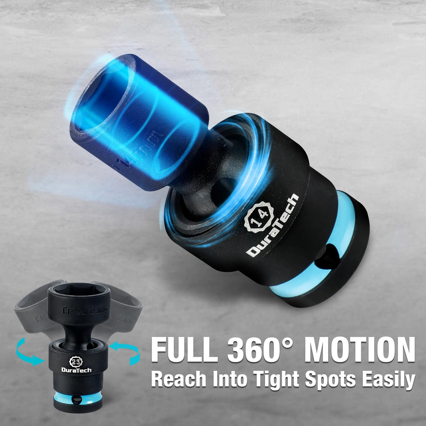 Duratech 1/2" Drive Impact Swivel Socket Set, 13-Piece Shallow Wobble Sockets, Universal Joint Socket Set Metric, Cr-Mo Steel, 6 Point, Organized In Sturdy Storage Case(10-24Mm)