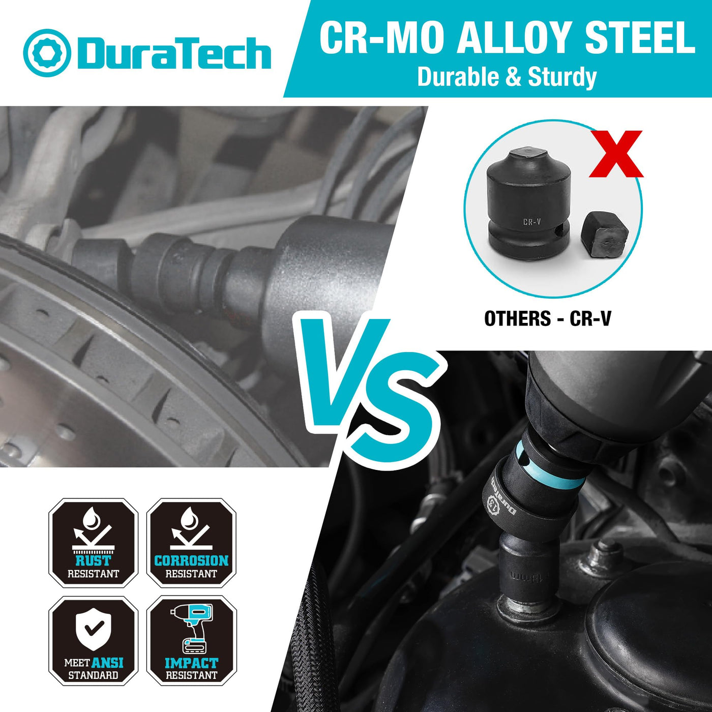 Q: Is the DURATECH swivel socket set durable and resistant to corrosion?A: Yes, the DURATECH swivel socket set is made from premium impact-grade chrome molybdenum steel, which provides excellent durability, resistance to corrosion, and the ability to withstand extreme torque variations.