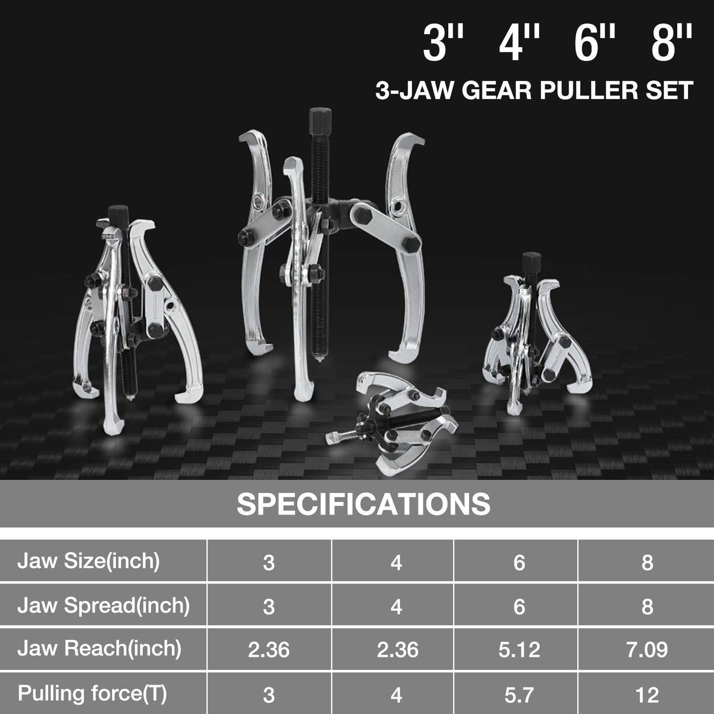 Duratech 4-Piece 3-Jaw Gear Puller, 3'', 4'', 6'', 8'', Removal Tool For Gears, Pulleys, Bearings And Flywheels, Fully Assembled