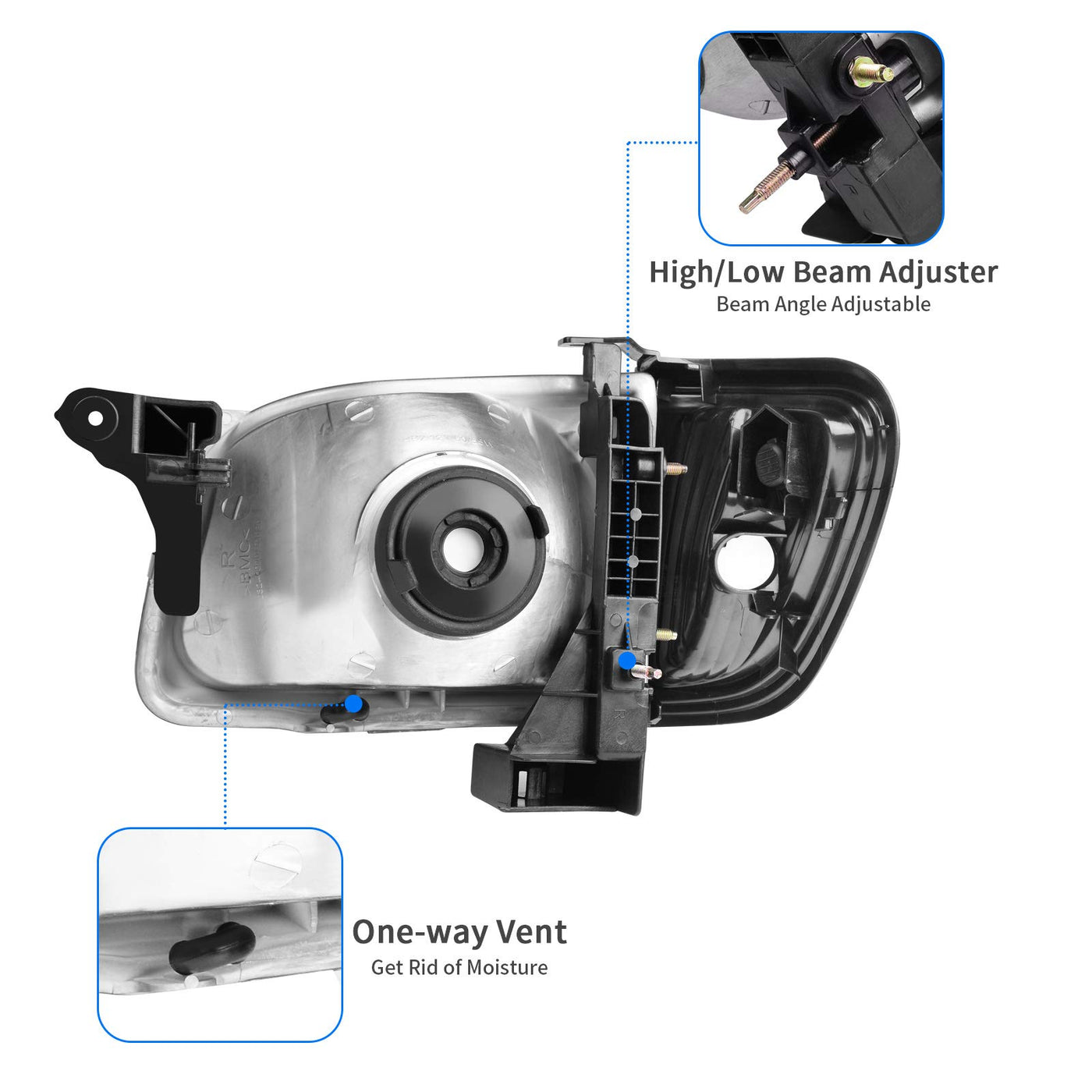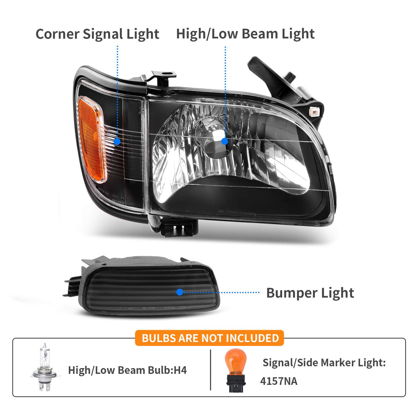Compatibility: the headlight assemblies are compatible with 2001 2002 2003 2004 Tacoma; high/low beam: H4; bulbs are not included | Improved illumination: the integrated metalized reflectors of this headlight assembly increase light distance for better visibility & driving safety in any dusky conditions | Weather-sealed: the fully sealed structure with solid silicon prevents moisture from being trapped inside the housing & provides reliable service in sorts of weather conditions such as rain, snow or dust storms | Impact-resistant & tough: constructed with durable polycarbonate lenses that give great protection against the abuse of road debris & impact from branches on the trail, and the high-impact housing also better withstands shock and vibration for your off-road adventures | Direct replacement: professional Installation would be highly recommended; come as a pair, including Driver (Left) & Passenger (Right) side