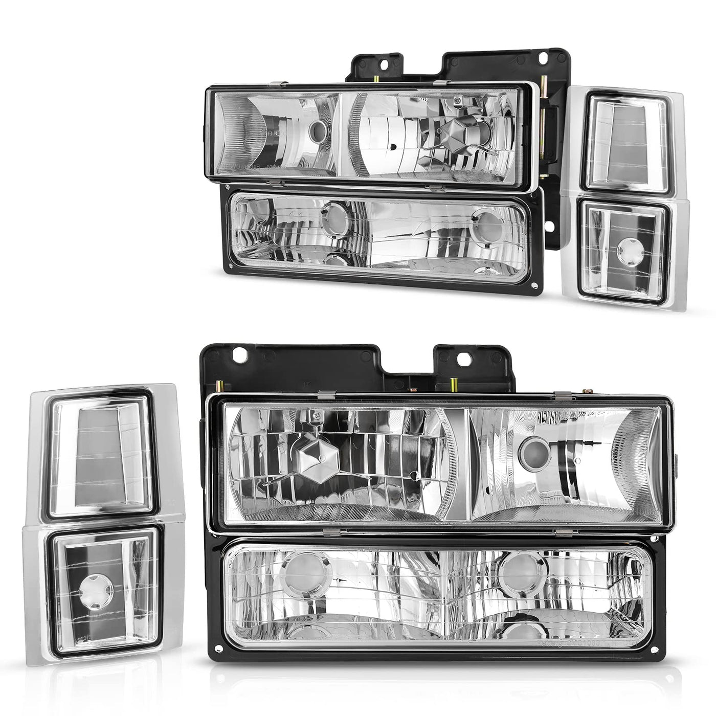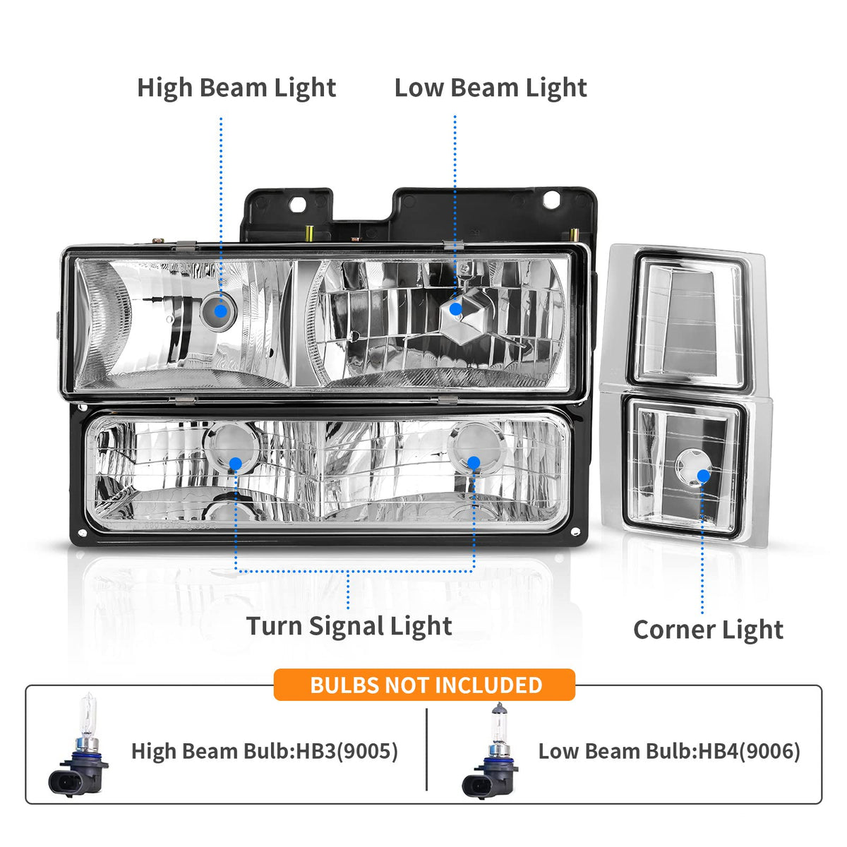 DWVO Headlight Assembly Compatible with Chevy C/K Series 1500 2500 3500/Tahoe/Suburban/Silverado 1994-1999 Crystal Headlamp w/Corner & Bumper Light (Chrome)