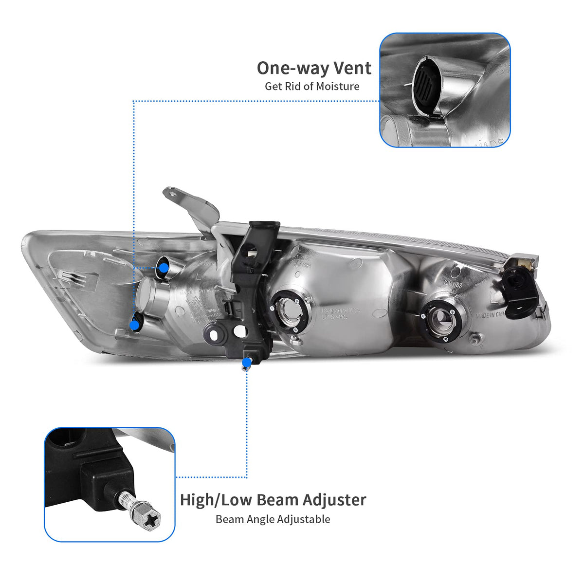Compatibility: the headlight assemblies are compatible with 2000-2001 Camry; high beam mode 9005 and low beam mode 9006; bulbs are not included | Improved illumination: the integrated metalized reflectors of this headlight assembly increase light distance for better visibility & driving safety in any dusky conditions | Weather-sealed: the fully sealed structure with solid silicon prevents moisture from being trapped inside the housing & provides reliable service in sorts of weather conditions such as rain, snow or dust storms | Impact-resistant & tough: constructed with durable polycarbonate lenses that give great protection against the abuse of road debris & impact from branches on the trail, and the high-impact housing also better withstands shock and vibration for your off-road adventures | Direct replacement: professional Installation would be highly recommended; come as a pair, including Driver (Left) & Passenger (Right) side