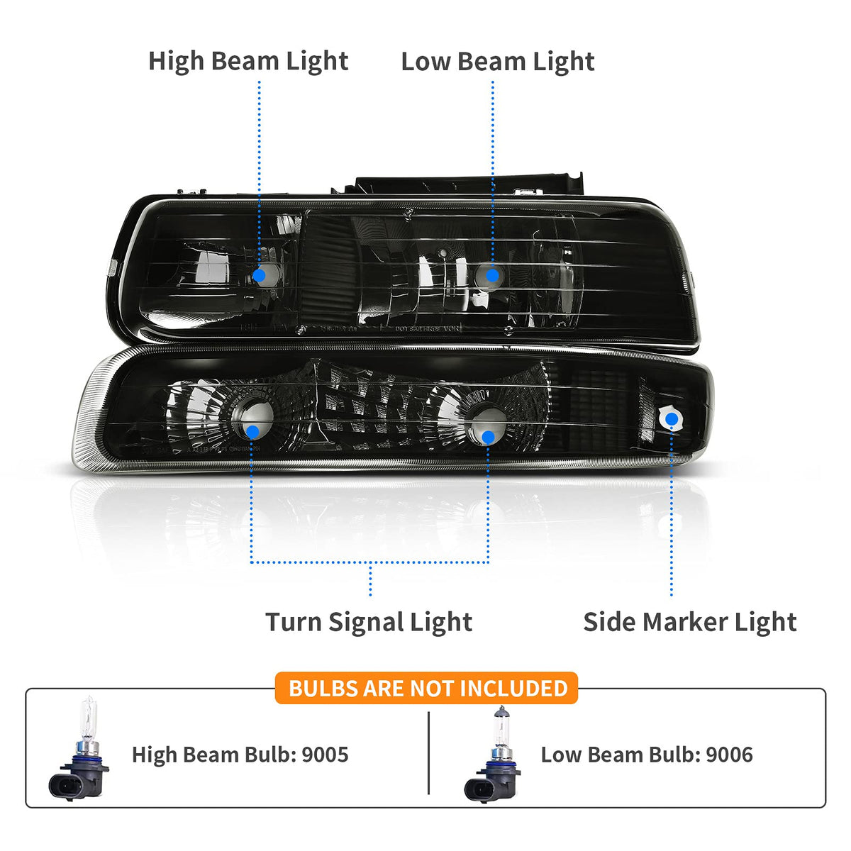 Compatibility: the headlight assemblies are compatible with 1999-2002 Chevrolet Silverado 1500 / 2500; 2001-2002 Chevrolet Silverado 1500HD / 2500HD / 3500; 2000-2006 Chevrolet Suburban 1500 / 2500; 2000-2006 Chevrolet Tahoe; high beam bulb type: HB3/9005; low beam bulb type:HB4/9006; bulbs are not included | Improved illumination: the integrated metalized reflectors of this headlight assembly increase light distance for better visibility & driving safety in any dusky conditions | Weather-sealed: the fully sealed structure with solid silicon prevents moisture from being trapped inside the housing & provides reliable service in sorts of weather conditions such as rain, snow or dust storms | Impact-resistant & tough: constructed with durable polycarbonate lenses that give great protection against the abuse of road debris & impact from branches on the trail, and the high-impact housing also better withstands shock and vibration for your off-road adventures | Direct replacement: professional Installation would be highly recommended; come as a pair, including Driver (Left) & Passenger (Right) side