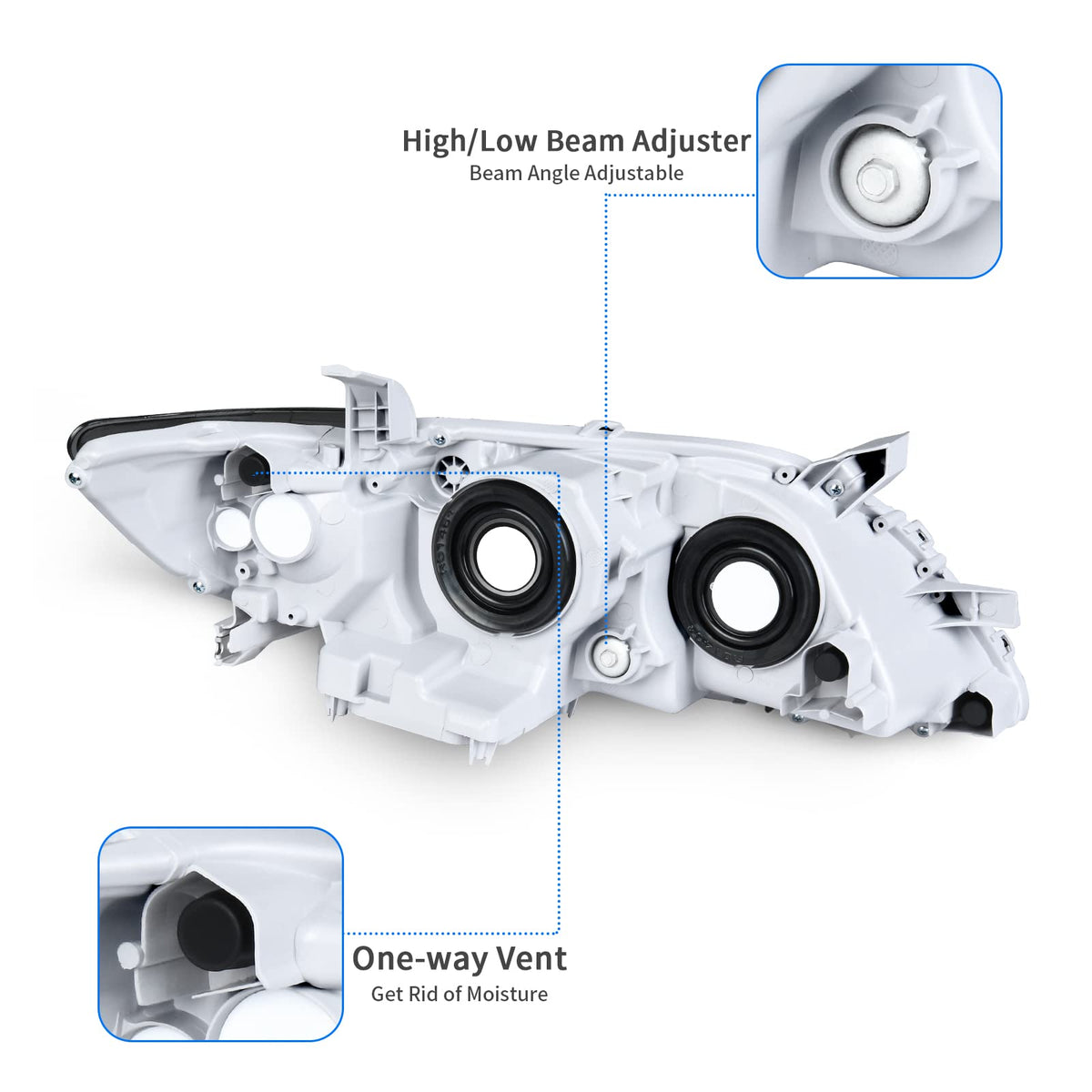 Compatibility: the headlight assemblies are compatible with 2007 2008 2009 07-09 Camry(4-Door Sedan); Only fits US Version; Not fits Camry Hybrid Model; low beam: H11; high beam: 9005/HB3; bulbs are not included | Improved illumination: the integrated metalized reflectors of this headlight assembly increase light distance for better visibility & driving safety in any dusky conditions | Weather-sealed: the fully sealed structure with solid silicon prevents moisture from being trapped inside the housing & provides reliable service in sorts of weather conditions such as rain, snow or dust storms | Impact-resistant & tough: constructed with durable polycarbonate lenses that give great protection against the abuse of road debris & impact from branches on the trail, and the high-impact housing also better withstands shock and vibration for your off-road adventures | Direct replacement: professional Installation would be highly recommended; come as a pair, including Driver (Left) & Passenger (Right) side