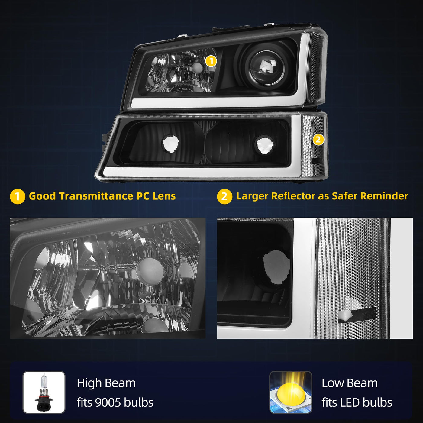 Compatibility: the headlight assemblies are compatible with 2003-2006 Chevy Silverado 1500/1500 HD / 2500 HD / 3500; 2003-2004 Chevy Silverado 2500; 2007 Chevy Silverado 1500/1500 HD/2500 HD/3500 Classic; 2003-2006 Chevy Avalanche 1500/2500 Pickup (Without Body Cladding); high beam bulb type: H1; low beam bulb type:H3; bulbs are included | Cutting-edge light design: sleek bright LED daytime running lamps raise the visibility to make it more conspicuous & complete its look of your vehicle; and the projector lens provides you stronger and more concentrated light output | Weather-sealed: the fully sealed structure with solid silicon prevents moisture from being trapped inside the housing & provides reliable service in sorts of weather conditions such as rain, snow or dust storms | Impact-resistant & tough: constructed with durable polycarbonate lenses that give great protection against the abuse of road debris & impact from branches on the trail, and the high-impact housing also better withstands shock and vibration for your off-road adventures | Direct replacement: professional Installation would be highly recommended; come as a pair, including Driver (Left) & Passenger (Right) side