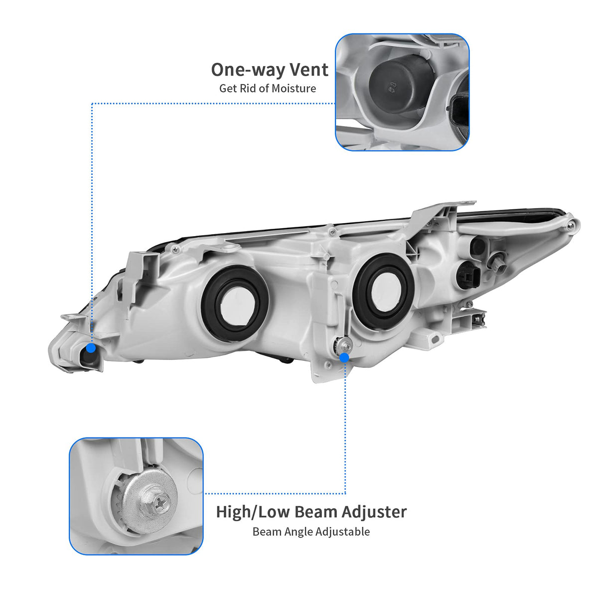 Compatibility: the headlight assemblies are compatible with 2012 2013 2014 Camry L/LE/XLE/Hybrid LE/Hybrid XLE; Not Fit SE/SE Sport/Hybrid SE; high beam mode 9005 and low beam mode H11; bulbs are not included | Improved illumination: the integrated metalized reflectors of this headlight assembly increase light distance for better visibility & driving safety in any dusky conditions | Weather-sealed: the fully sealed structure with solid silicon prevents moisture from being trapped inside the housing & provides reliable service in sorts of weather conditions such as rain, snow or dust storms | Impact-resistant & tough: constructed with durable polycarbonate lenses that give great protection against the abuse of road debris & impact from branches on the trail, and the high-impact housing also better withstands shock and vibration for your off-road adventures | Direct replacement: professional Installation would be highly recommended; come as a pair, including Driver (Left) & Passenger (Right) side