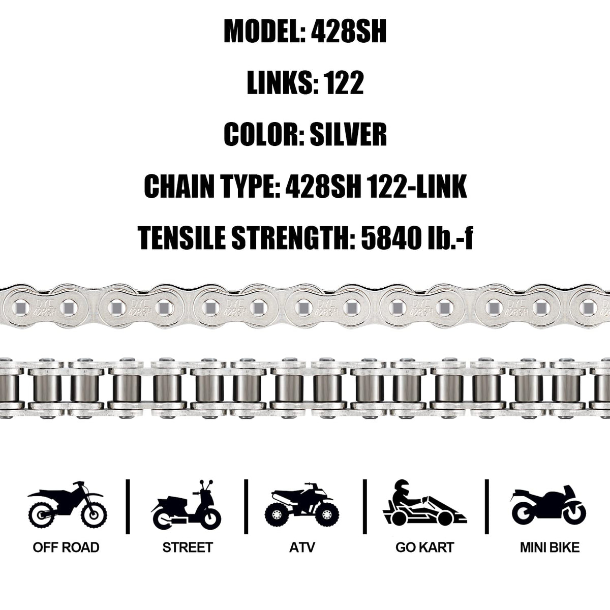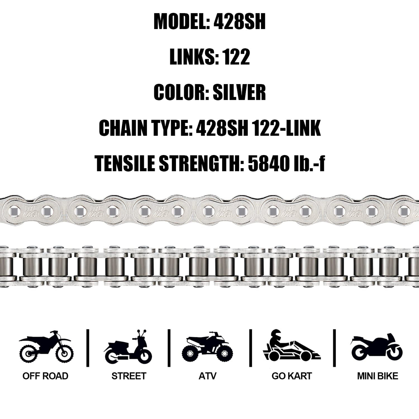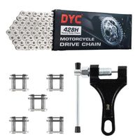 DYC 428H Heavy-Duty Motorcycle Chain with Chain Breaker and Master Links - The Ultimate Upgrade for Motorcycles, Mini Bikes, Dirt Bikes, and Go-Karts! The DYC 428H heavy-duty motorcycle chain is designed to handle the demands of high-performance vehicles. Featuring 122 links, this chain is compatible with 125cc, 150cc, and 200cc engines, making it ideal for motorcycles, mini bikes, dirt bikes, go-karts, and ATVs. Its specifically engineered for vehicles from popular Chinese brands like SSR, TaoTao, Coolster, Apollo, Baja, and Kazuma. Built with high-strength steel, this chain offers exceptional durability and resistance to wear and tear, even in extreme conditions. The included chain breaker tool and master links simplify installation and maintenance, whether youre a seasoned mechanic or a first-time DIYer. Key Features: Heavy-Duty Construction: Designed for high torque and extreme performance, ensuring long-lasting reliability. Complete Kit: Comes with a chain breaker tool and master links for quick installation and adjustment. Optimized Power Transfer: Reduces friction and noise, delivering smooth and efficient performance for mini bikes and dirt bikes. Wide Vehicle Compatibility: Perfect for Chinese ATVs, motorcycles, dirt bikes, and go-karts from brands like SSR, TaoTao, and Apollo. Resistant to Harsh Conditions: Rust- and corrosion-resistant design ensures reliable operation in wet, muddy, and off-road environments. Whether youre replacing an old chain or upgrading your vehicles performance, the DYC 428H heavy-duty motorcycle chain is your go-to choice. Experience smoother rides, reliable performance, and extended durability with this premium chain.