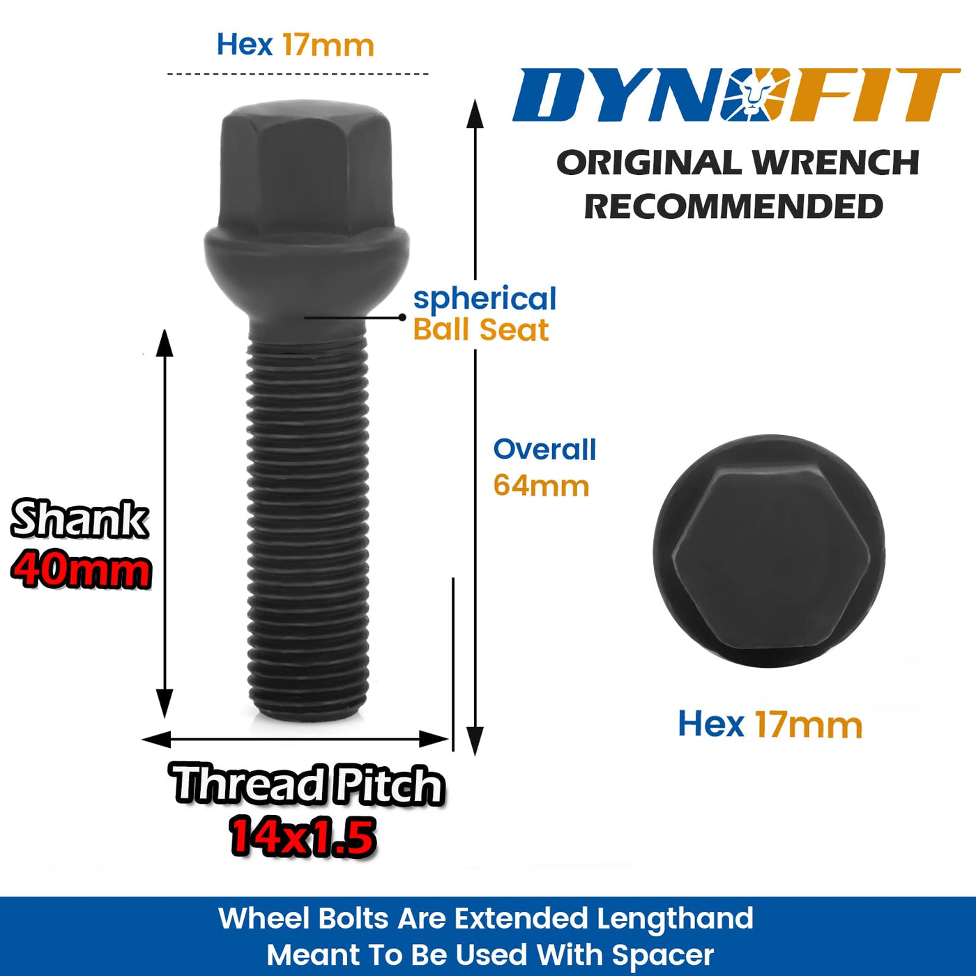 dynofit 14x1.5 Extended Lug Bolts for Wheel Spacers, 20pcs 40mm Shank/64mm Tall Ball Seat Aftermarket Lug Studs for A1 A2 A3 A4 A5 A6 A7 A8 S1 S2 S3 S4 S5 S6 S7 S8, Fit CC Golf Jetta Lavid Se Cayenne