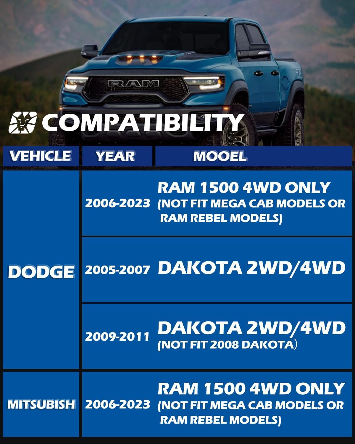 Dynofit Premium Leveling Lift Kits Series Size: 2.5'' raise front spacer leveling lift kits (Real thickness around 1.7'' but real 2.5'' raise due to suspension structure!) Fits Chart: 2006 2007 2008 2009 2010 2011 2012 2013 2014 2015 2016 2017 2018 2019 2020 2021 2022 2023 Dodge Ram 1500 4WD only, not fit 2WD (*Not fit Mega Cab Models or Ram Rebel Models) *NOTE: Not compatible with trucks equipped with the Active-Level Four-Corner Air Suspension About us: This Dodge lift kits provides a front 2.5 suspension lift it improve the appearance of your vehicles and support the dependable riding balance the aircraft billet aluminum will not compress or bend even the Max load.