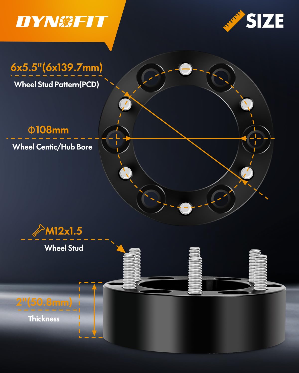 Dynofit 2'' Wheel Spacers 6X5.5 Compatible With Toyota 4Runner Tacoma Fj Cruiser, M12X1.5 Extended Lug Nuts, 108Mm Hub, 6X139.7
