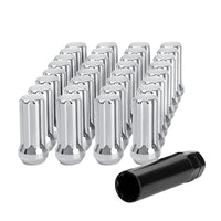 Q: How do I install the DYNOFIT lug nuts correctly?A: To install the DYNOFIT lug nuts, use the provided socket key to initially torque them. Then, tighten them further with a 21mm or 22mm hand wrench. It is recommended to re-tighten the lug nuts after driving for 100 miles and again after 1000 miles for optimal security.