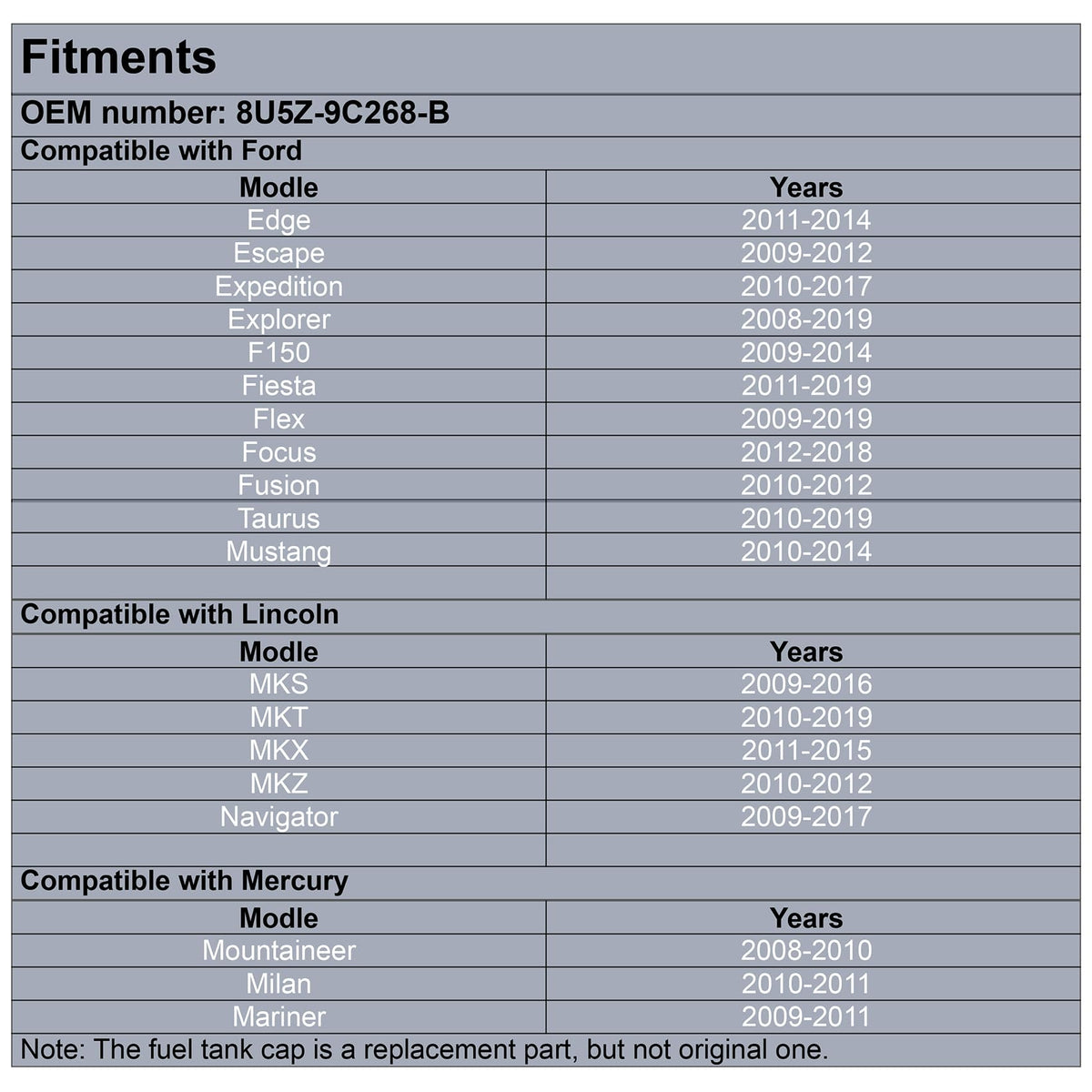 Q: Does this gas cap fit Lincoln and Mercury models as well?A: Yes, this gas cap is also compatible with several Lincoln models including MKS (2009-2016), MKT (2010-2019), MKX (2011-2015), MKZ (2010-2012), and Navigator (2009-2017), as well as Mercury models like Mountaineer (2008-2010), Milan (2010-2011), and Mariner (2009-2011).