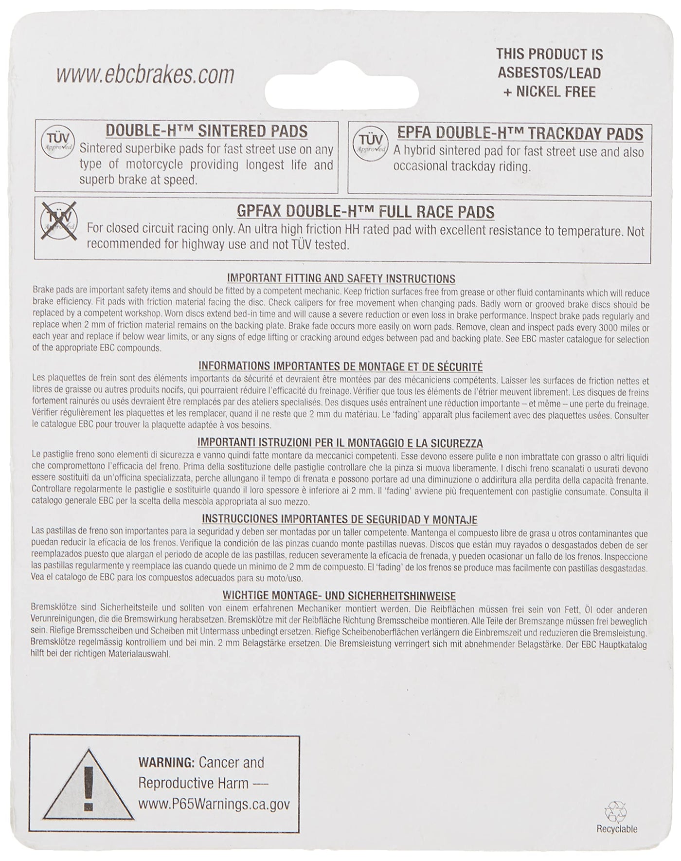 Q: What are the benefits of using EBC brake pads over other brands?A: EBC brake pads feature non-asbestos linings for health and environmental safety, along with original equipment style brake shoe springs. Their unique design includes radius ground and edge trimmed shoes to enhance performance and reduce noise.