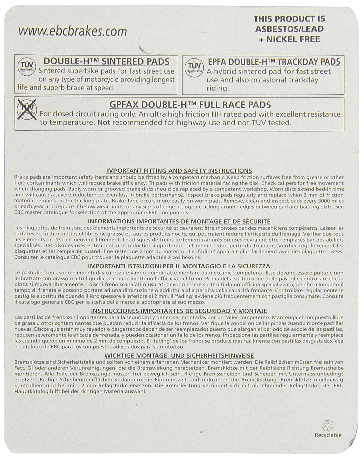 The Unique Double Segment Vented Design Keeps The Pads Cooler And Prevents Pad Drag And Overheat Or Fade. Double-H Pads Claimed Their Name From The Industry Standard Gauge For Measuring Friction Levels On Brake Pads; They Range From E, F, G Through To H Within One Year Of Their Launch In 2004, Double-H Became The Standard By Which All Brake Pads For Street Bikes Were Judged Because Of Their Long Lasting And Powerful Brake Effect. Being Made In The Ebc U.S.A. Sintering Plant And Available For 95% Of All Makes And Models Double-H Are Great Value For Money. These Pads Benefit From The Highest Friction Hh Rating For Maximum Stopping Power, Made From Sintered Copper Alloy Like Original Pads For Longer Life And Perfect Braking Under All Riding Conditions, Wet, Dry, Hot Or Cold. When Required, Unique Stainless Steel Radiator Plates Are Fitted To Reduce Heat Transfer Into Bikes Hydraulics.