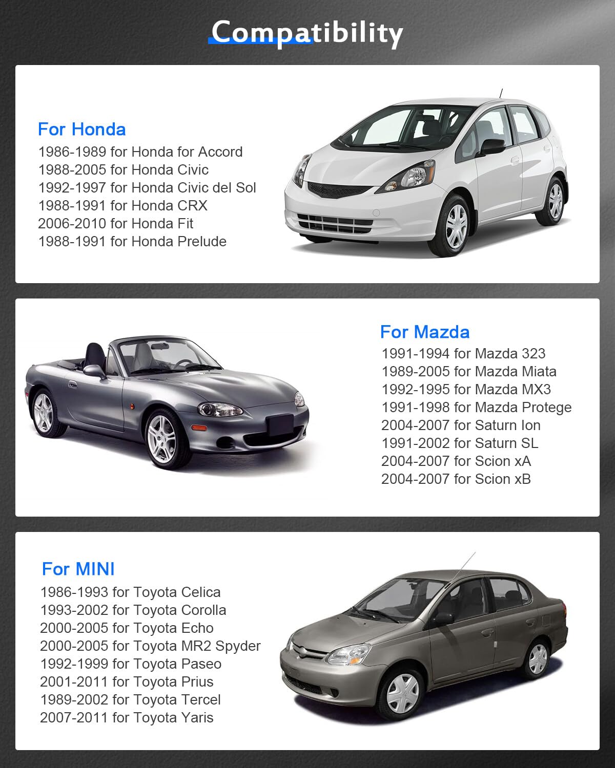 Vehicle Compatibility InformationVehicle Bolt Pattern 4x100 Wheel Bolt Pattern 4x100Fitment:1986-1989 for Accord 1988-2005 for Civic 1993-1997 for Civic del Sol 1988-1991 for CRX 2006-2010 for Fit 1988-1991 for Prelude 1991-1994 for 323 1990-2005 for Miata 1991-1998 for Protege 2004-2007 for Ion*** Don't see your vehicle above? with the year/make/model of your vehicle and we'll be glad to find a compatible spacer ***Package Including4pcs wheel spacers