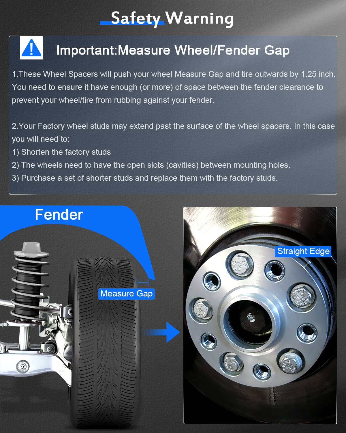 Q: How do I install the 5x4.5 wheel spacers?A: To install the 5x4.5 wheel spacers, begin by ensuring that your vehicle has at least 2 inches of space between the fender and the wheel/tire. Remove the wheel, place the spacer onto the hub, and secure it using the included lug nuts. Always double-check that the wheel studs are compatible and correctly torqued.
