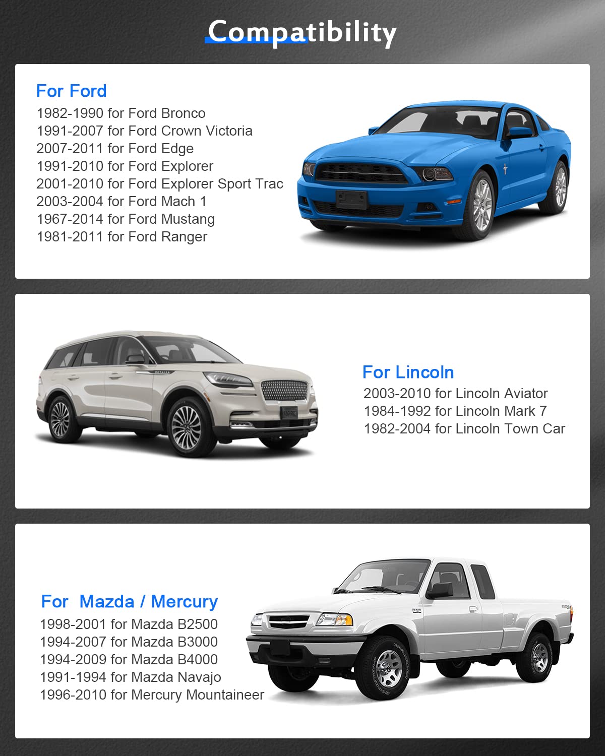 Fitments:1967-1973 For Mustang1994-2014 For Mustang2007-2011 For Edge2003-2004 For Mach 11991-2007 For Crown Victoria1982-1990 For Bronco (Does Not Fit Xlt Model)1981-2011 For Ranger (2Wd/4Wd Models, Will Not Fit On Front Hub)1991-2010 For Explorer (2Wd Models, Will Not Fit On Front Hub)1984-1992 For Mark 701982-2004 For Town Car2003-2010 For Aviator1996-2010 For Mountaineerpackage Including2 Wheel Spacers + 10 Lug Nuts