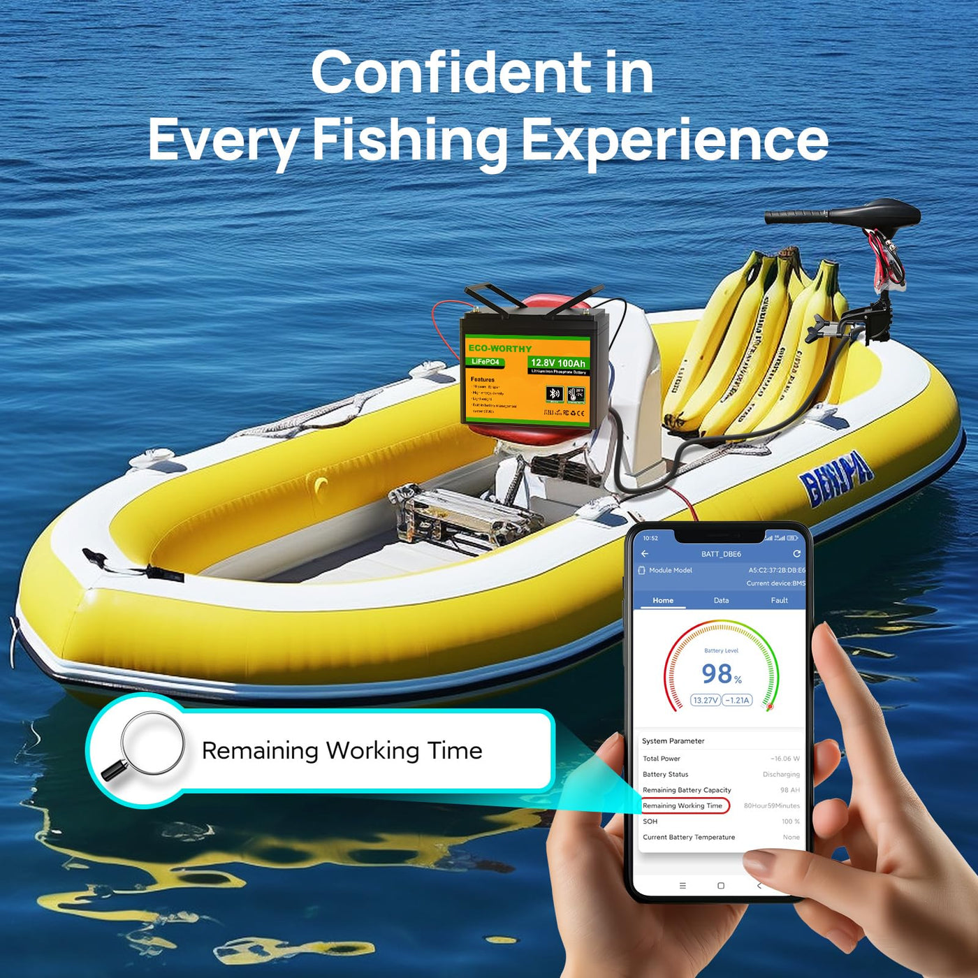 ECO-WORTHY 12V 100AH LiFePO4 Lithium Battery with Bluetooth, Max.1280Wh Energy with 10 Years Lifetime. 100A BMS with Low Temperature Protection, Perfect for Trolling Motor, RV, Boat, Solar Off-Grid