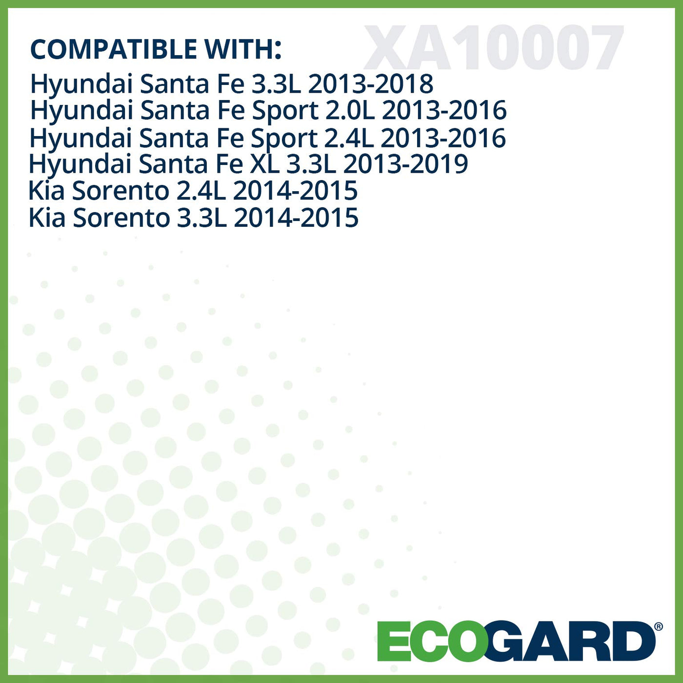 Changing your engine air filter is a small task that can have a big impact on engine performance and longevity. For optimal engine health, its recommended that the engine air filter be replaced every 12 months or 12,000 miles. Most engine air filters are very easy to change - requiring few, or no tools and only a few minutes of your time.ECOGARD XA10007 COMPATIBLE WITH:Hyundai Santa Fe 3.3L 2013-2018Hyundai Santa Fe Sport 2.0L 2013-2016Hyundai Santa Fe Sport 2.4L 2013-2016Hyundai Santa Fe XL 3.3L 2013-2019Kia Sorento 2.4L 2014-2015Kia Sorento 3.3L 2014-2015