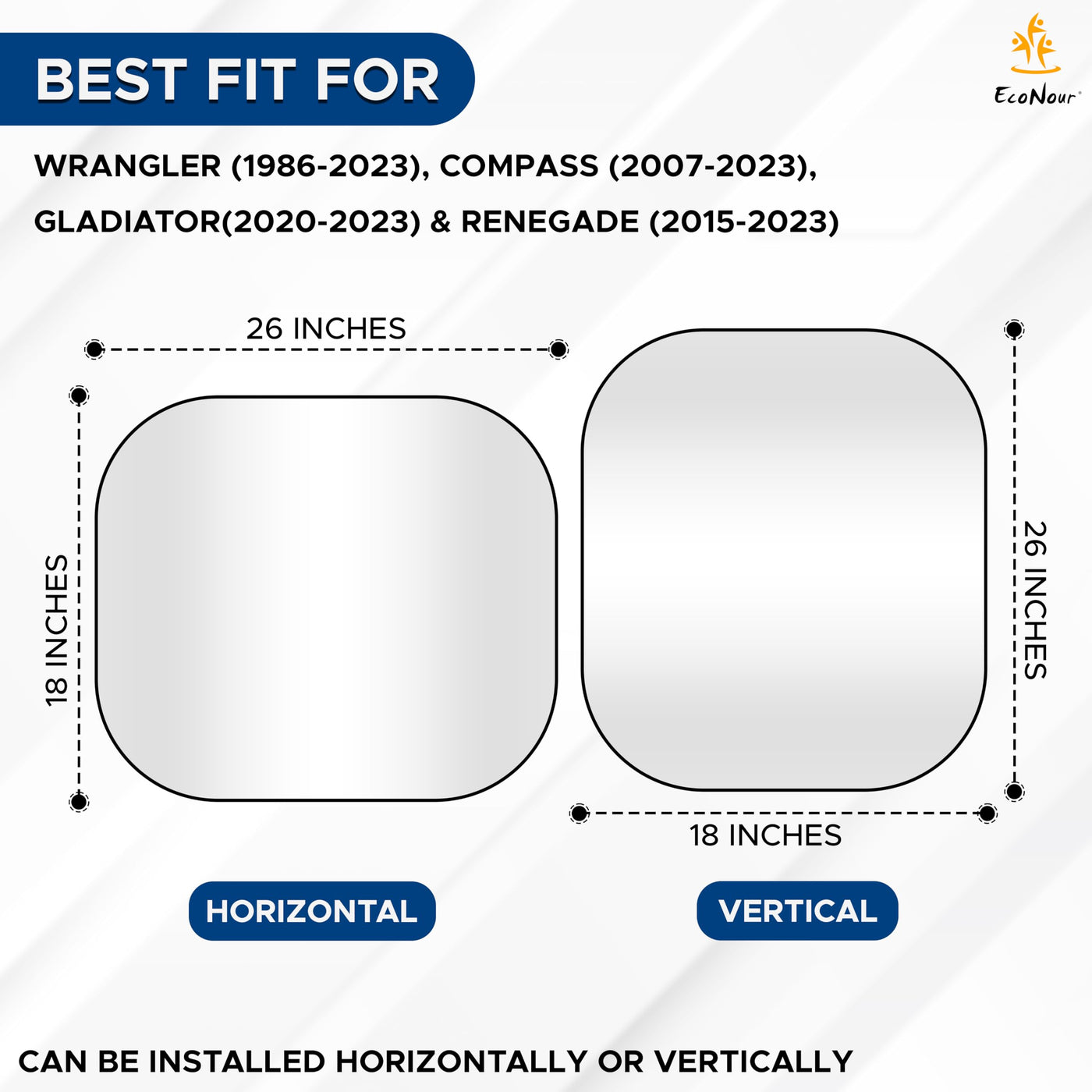 The Econour 2-Piece Windshield Sun Shade For Jeep Provides Complete Automotive Sun Protection With Its Foldable Design, Making It An Essential Accessory For Your Vehicle. This High-Quality Sun Shade Is Tailored To Fit A Variety Of Jeep Models, Including Wrangler, Compass, Gladiator, And Renegade, Ensuring A Perfect Fit Every Time. Measuring X-Small 18 Inches By 26 Inches, It Effectively Blocks Harmful Uv Rays And Reduces The Interior Temperature, Protecting Your Car 'S Dashboard, Seats, And Electronics From Sun Damage. Easy To Install And Store, The Econour Windshield Sun Shade Is The Ultimate Solution For Maintaining A Cool And Comfortable Car Environment.