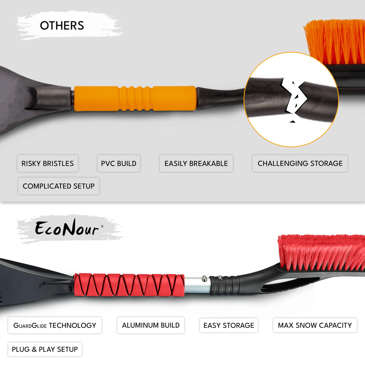 Q: How do I care for and maintain the EcoNour snow scraper and brush?A: To maintain the EcoNour snow scraper and brush, simply rinse off any debris after use and store it in a dry place. Avoid exposing the brush to extreme heat or direct sunlight for prolonged periods to extend its lifespan.
