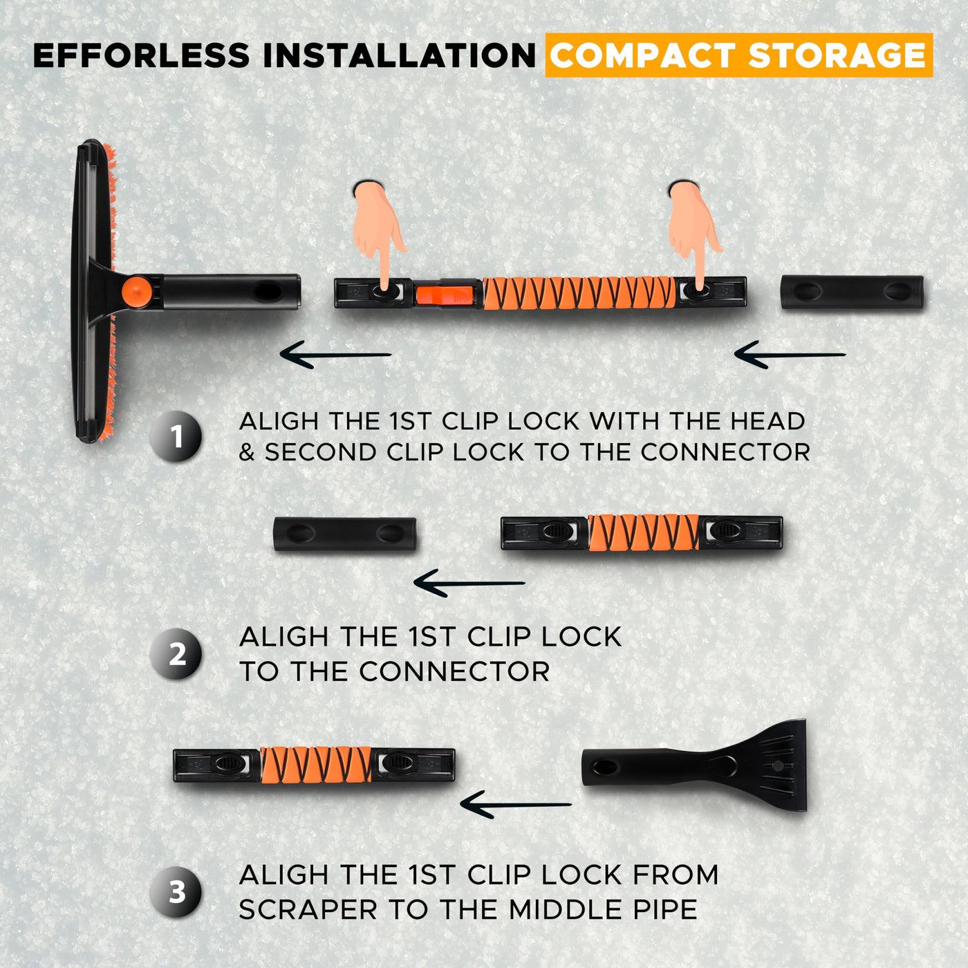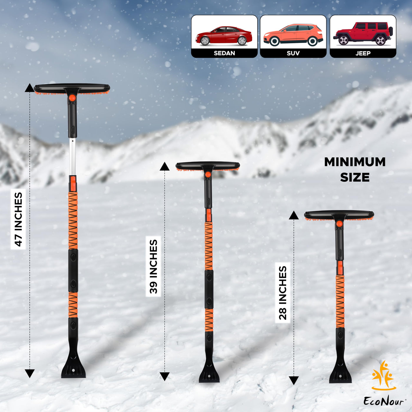 EcoNours 47 Extendable Snow Brush and Ice Scraper is designed to tackle winter weather challenges by easily removing snow, ice, and frost from your vehicle. Made with high-quality materials, this snow scraper is durable and reliable. The snow brush features soft bristles that prevent scratches while efficiently sweeping away snow. The 270 pivoting squeegee is ideal for wiping moisture off your windshield after snow removal, while the chiseled blade of the ice scraper can break through stubborn ice. This versatile tool also includes an adjustable telescoping handle, making it easy to reach the entire surface of your vehicle, from the windshield to the roof. The compact design allows for easy storage, ensuring youre always prepared for winter conditions.
