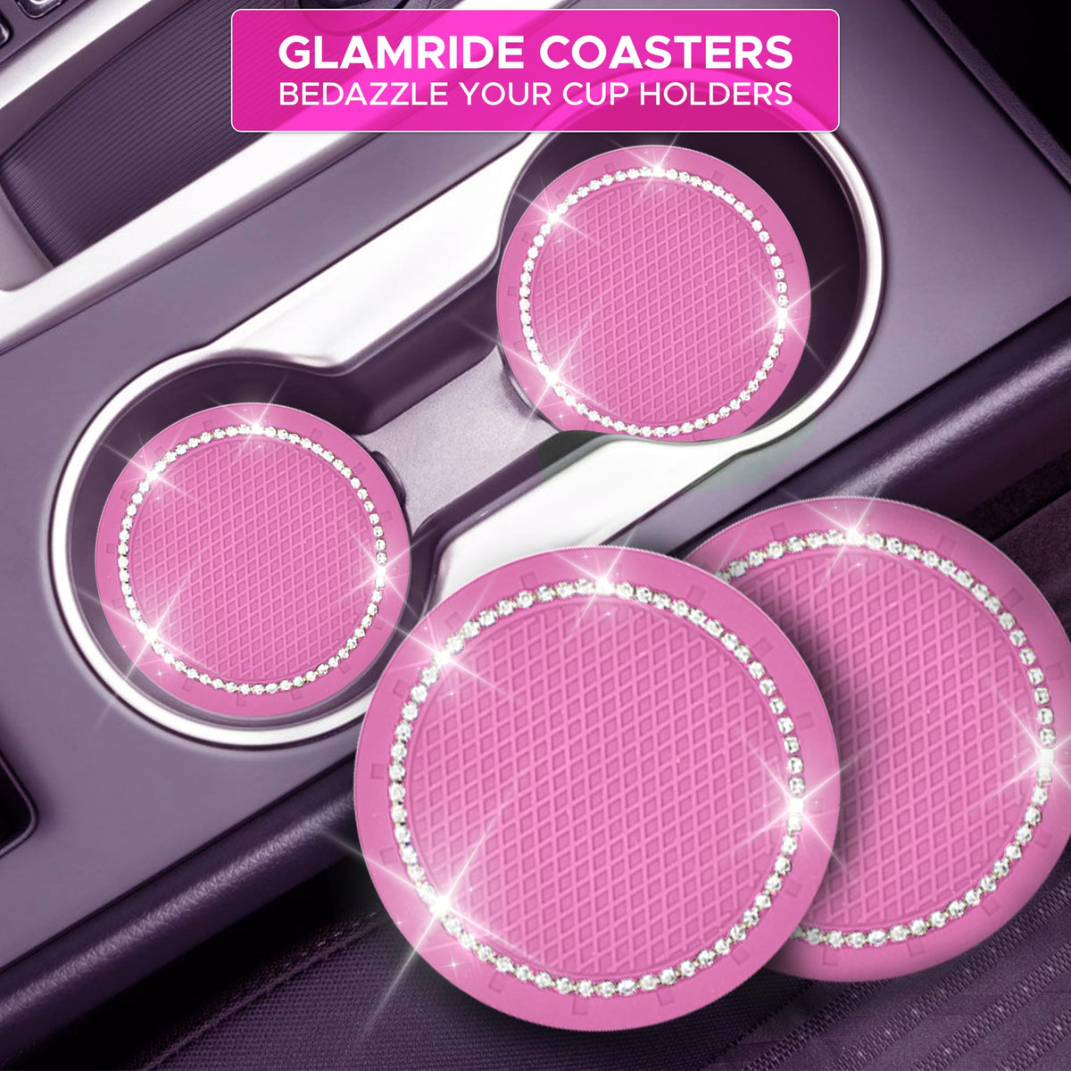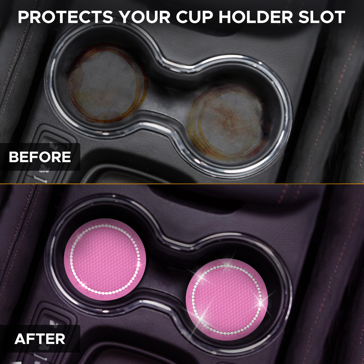 EcoNour Car Cup Coasters (2 Pack) with Pink Push Start Button Bling Ring (1 Pack) | Pink Car Interior Accessories for Women | Cl