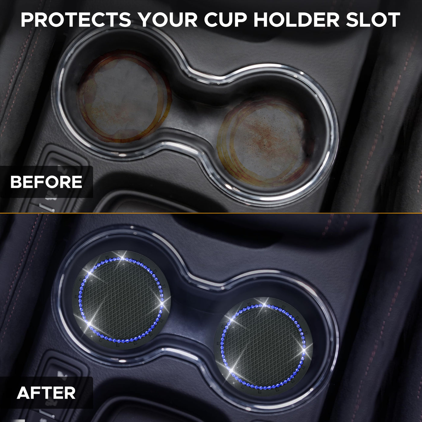EcoNour Car Cup Coasters Black (2 Pack) with Blue Push Start Button Bling Ring (1 Pack) | Anti-Slip Car Coasters for Cup Holders | Classy & Elegant Blue Rhinestone Car Interior Accessories for Women
