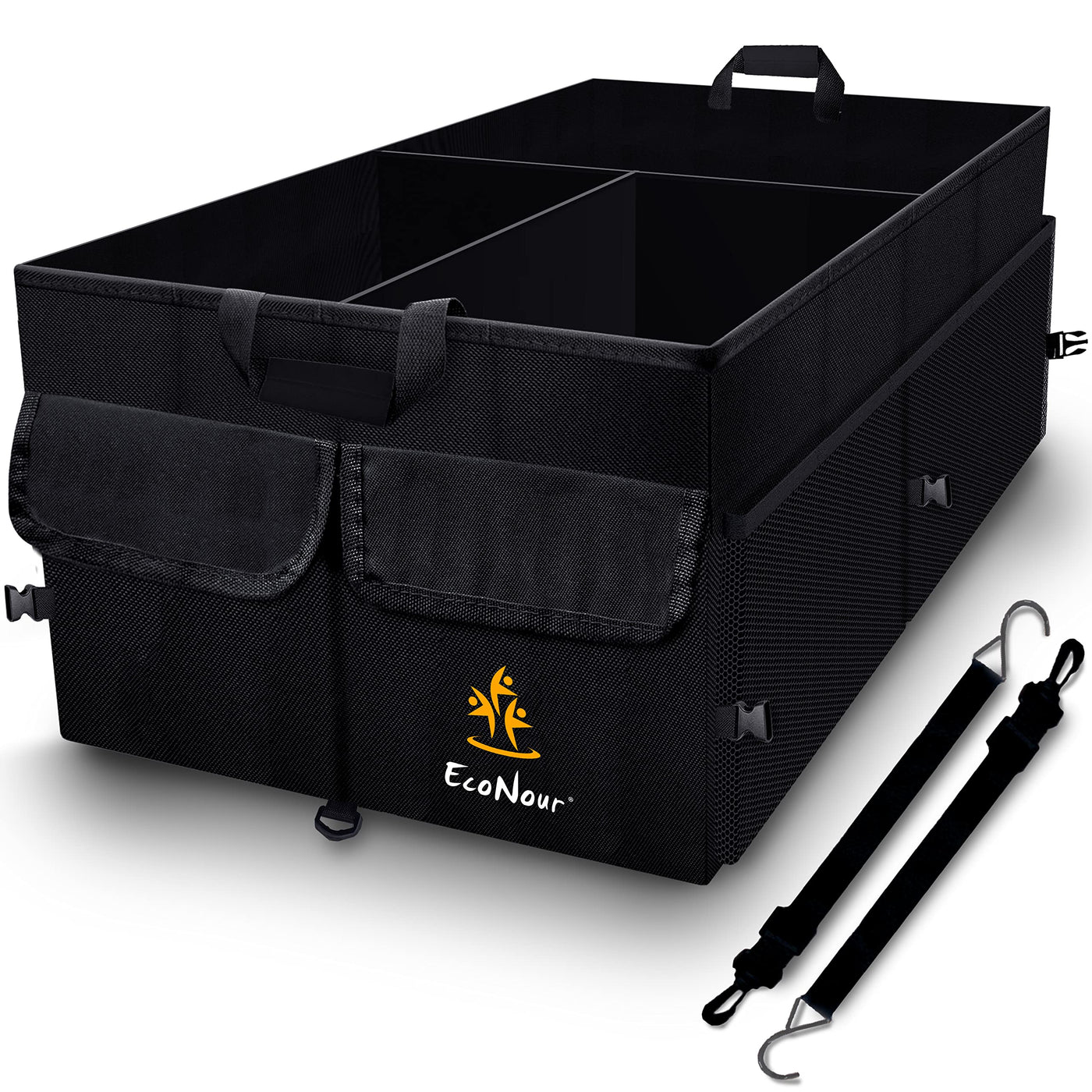 EcoNour trunk organizer universally compatible with all makes and models of cars, trucks, vans, and SUVAs, our car tote trunk organizer boasts non-skid rubber bottom panels to hold it firmly in place and prevent spillage of contents With two divided sections fully expanded volume is 21 x 15 x 10 inch, you can use one or expand to use both One side has two compartments to organize items while the other is a large open area It helps you organize your trunk and make your trunk have more space to store a lot You can even take the trunk organizer straight to the supermarket, the park, the beach, or the big game the rugged handles allow it to be carried even when fully loaded Very easy to clean that you can simply wipe with a wet cloth and it is made of waterproof fabric
