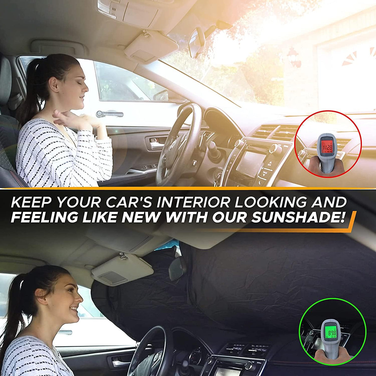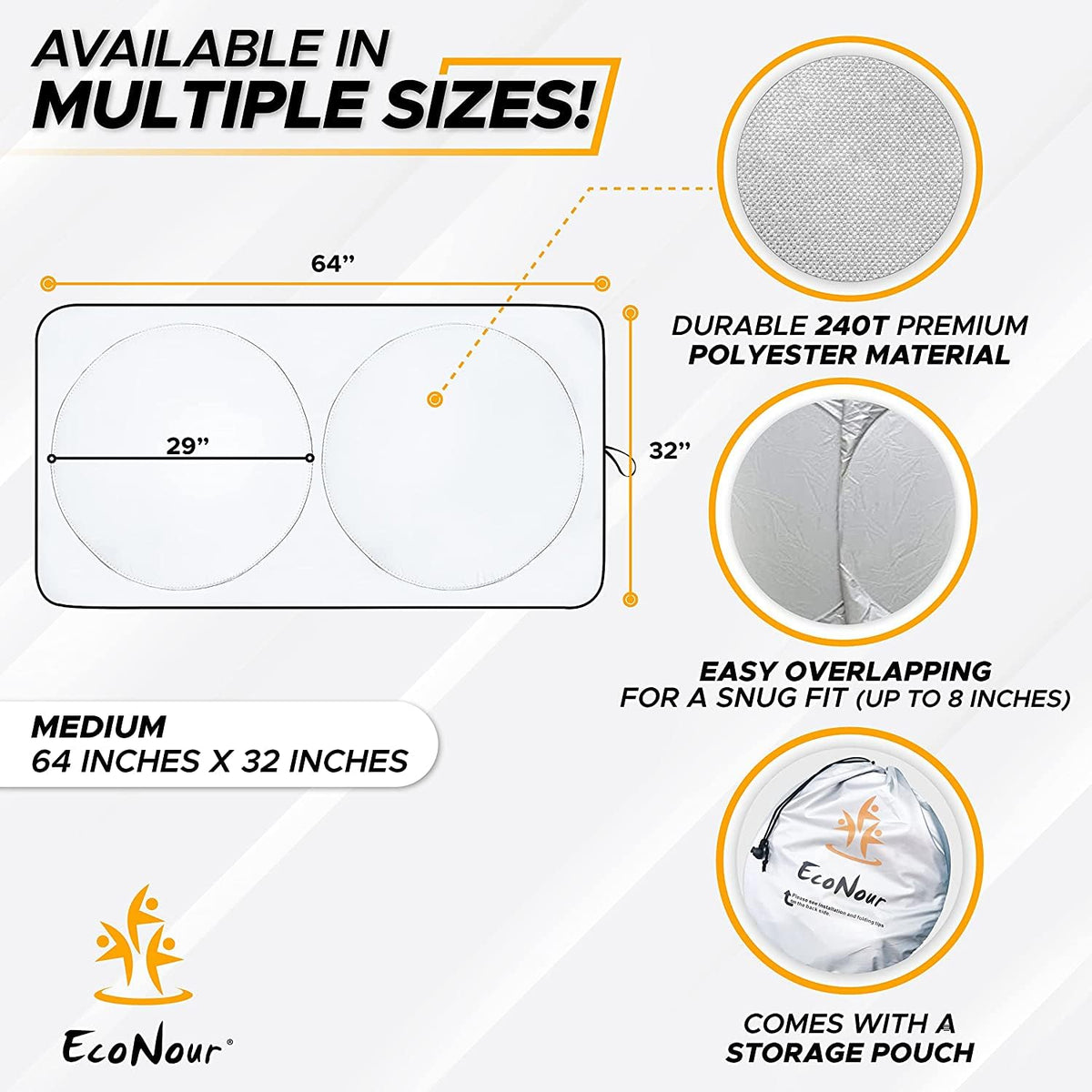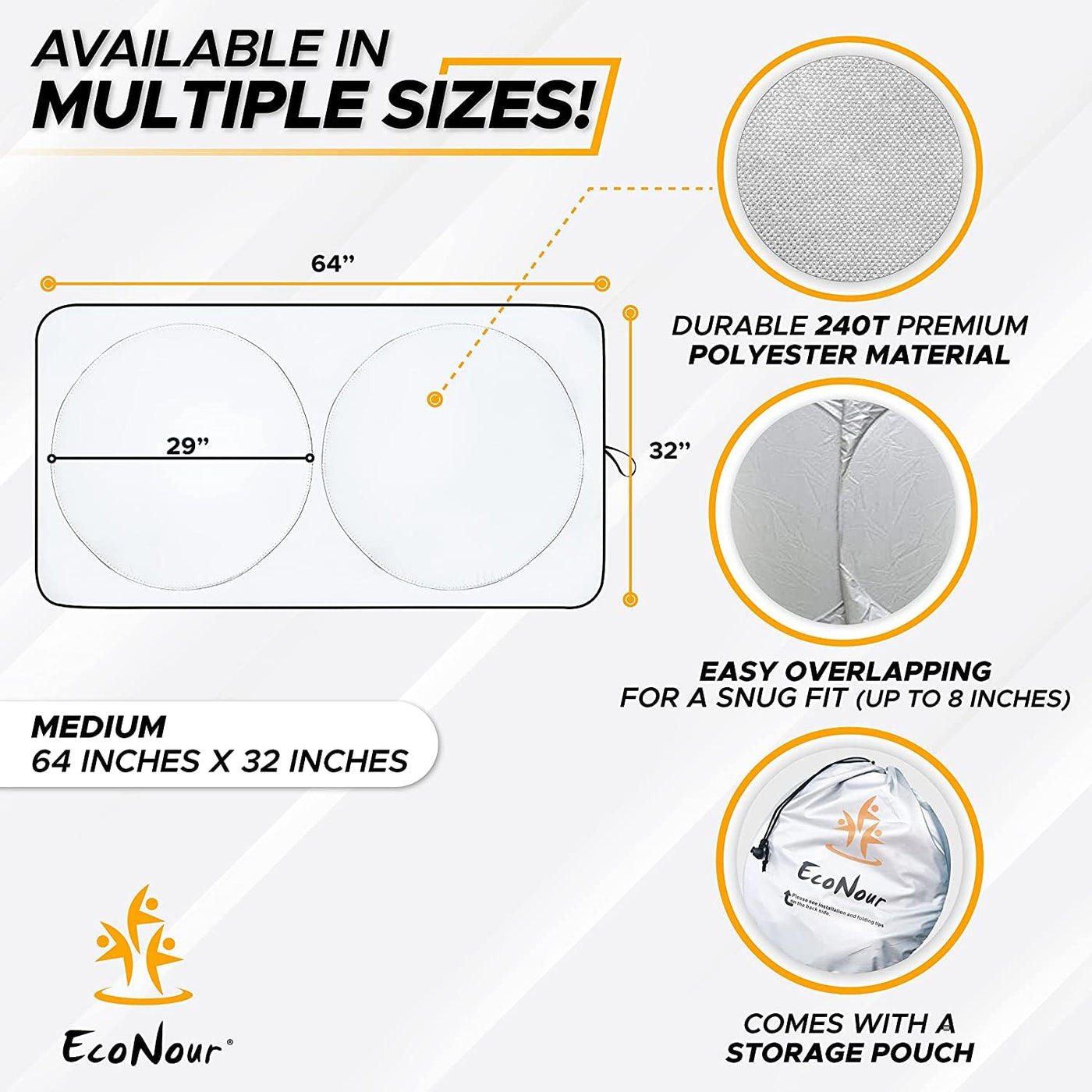 Enhanced Sun Protection: Protect your car interior from harmful UV rays with EcoNour’s durable windshield sun shade. Made from high-quality 240T polyester, it effectively blocks sunlight, keeping your vehicle cool and safeguarding your dashboard and upholstery. This car sun shade windshield is essential for a comfortable drive. | Reinforced Overlapping Design: Unlike traditional sun shades, EcoNour features a unique overlapping design that extends upto 8 inches to ensure a snug fit, covering the windshield's edges and providing optimal coverage. Fits windshields upto 64x32 inches, making it ideal for small sedans, mini SUVs, and hatchbacks. This sun shade for car windshield is designed for versatility. | Compact and Easy to Use: Pop up, install, and fold away in seconds! The foldable design allows for easy storage in the included pouch, making it hassle-free to use daily. Perfect for those looking for windshield sun shade foldable options. | Durability You Can Trust: Crafted from premium 240T polyester, our windshield sunshade is designed to last and resist wear over time. It provides superior performance in hot weather conditions, ensuring your car stays cooler. This automotive windshield sunshade is built for long-lasting use. | Choose the Right Fit: Available in multiple sizes to suit various vehicle models. Use the size chart to select the best fit for your car's windshield. Our car sun shade options cater to all vehicle types, ensuring maximum protection.