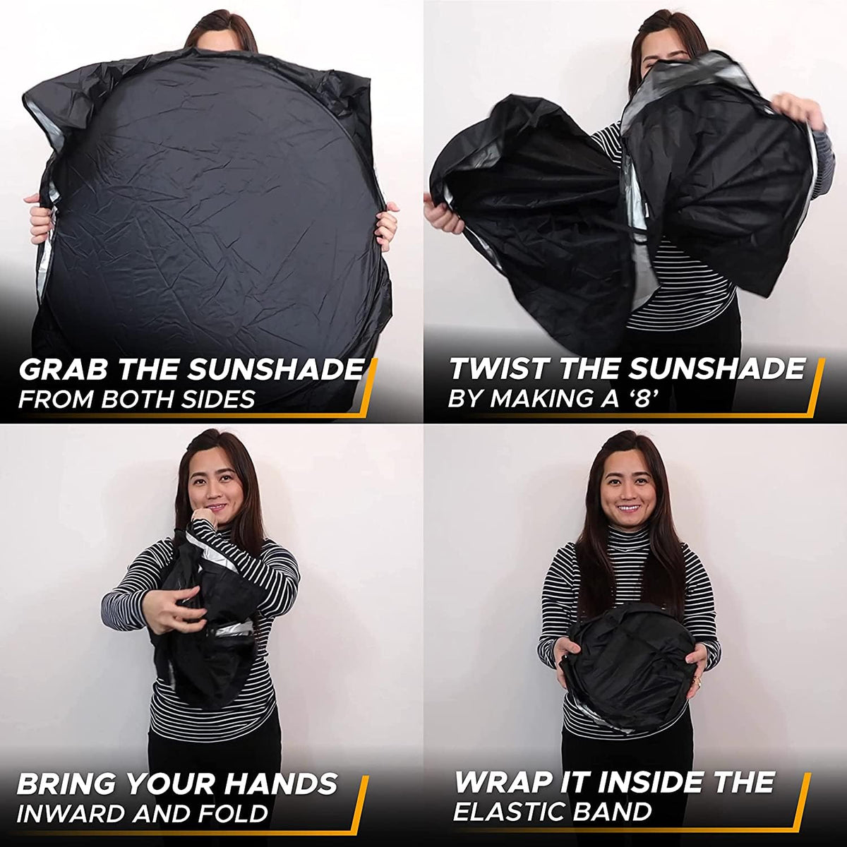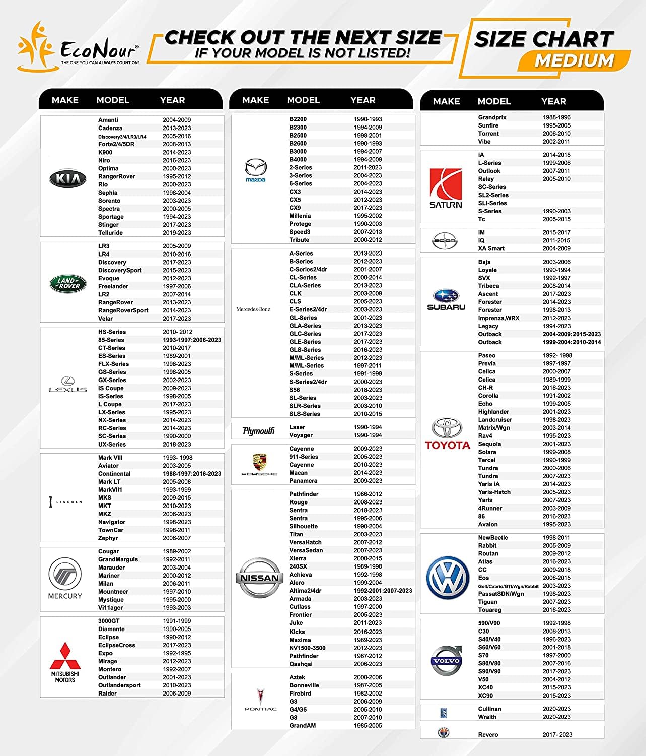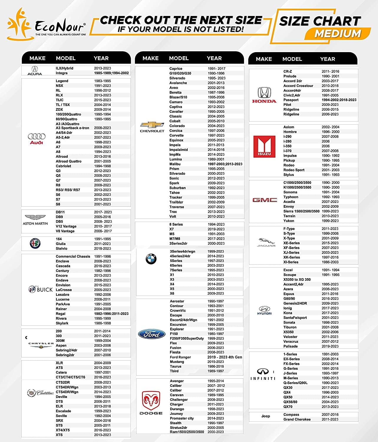 Enhanced Sun Protection: Protect your car interior from harmful UV rays with EcoNour’s durable windshield sun shade. Made from high-quality 240T polyester, it effectively blocks sunlight, keeping your vehicle cool and safeguarding your dashboard and upholstery. This car sun shade windshield is essential for a comfortable drive. | Reinforced Overlapping Design: Unlike traditional sun shades, EcoNour features a unique overlapping design that extends upto 8 inches to ensure a snug fit, covering the windshield's edges and providing optimal coverage. Fits windshields upto 64x32 inches, making it ideal for small sedans, mini SUVs, and hatchbacks. This sun shade for car windshield is designed for versatility. | Compact and Easy to Use: Pop up, install, and fold away in seconds! The foldable design allows for easy storage in the included pouch, making it hassle-free to use daily. Perfect for those looking for windshield sun shade foldable options. | Durability You Can Trust: Crafted from premium 240T polyester, our windshield sunshade is designed to last and resist wear over time. It provides superior performance in hot weather conditions, ensuring your car stays cooler. This automotive windshield sunshade is built for long-lasting use. | Choose the Right Fit: Available in multiple sizes to suit various vehicle models. Use the size chart to select the best fit for your car's windshield. Our car sun shade options cater to all vehicle types, ensuring maximum protection.
