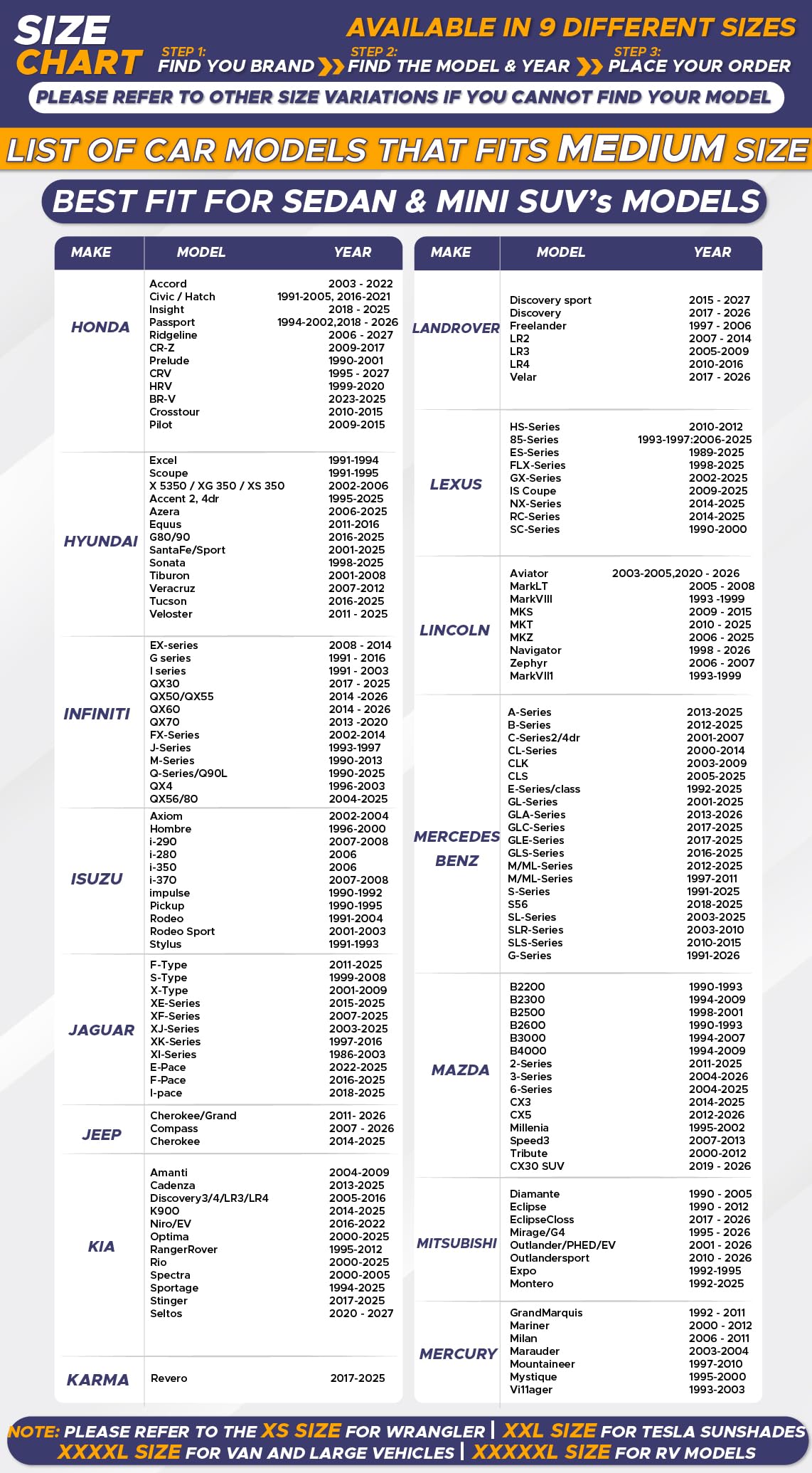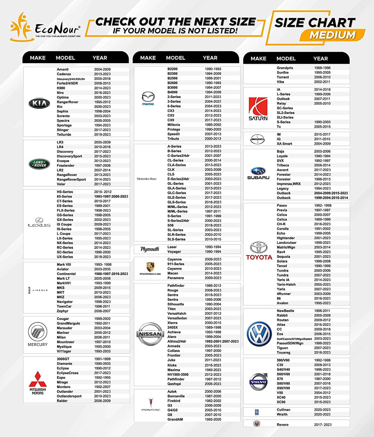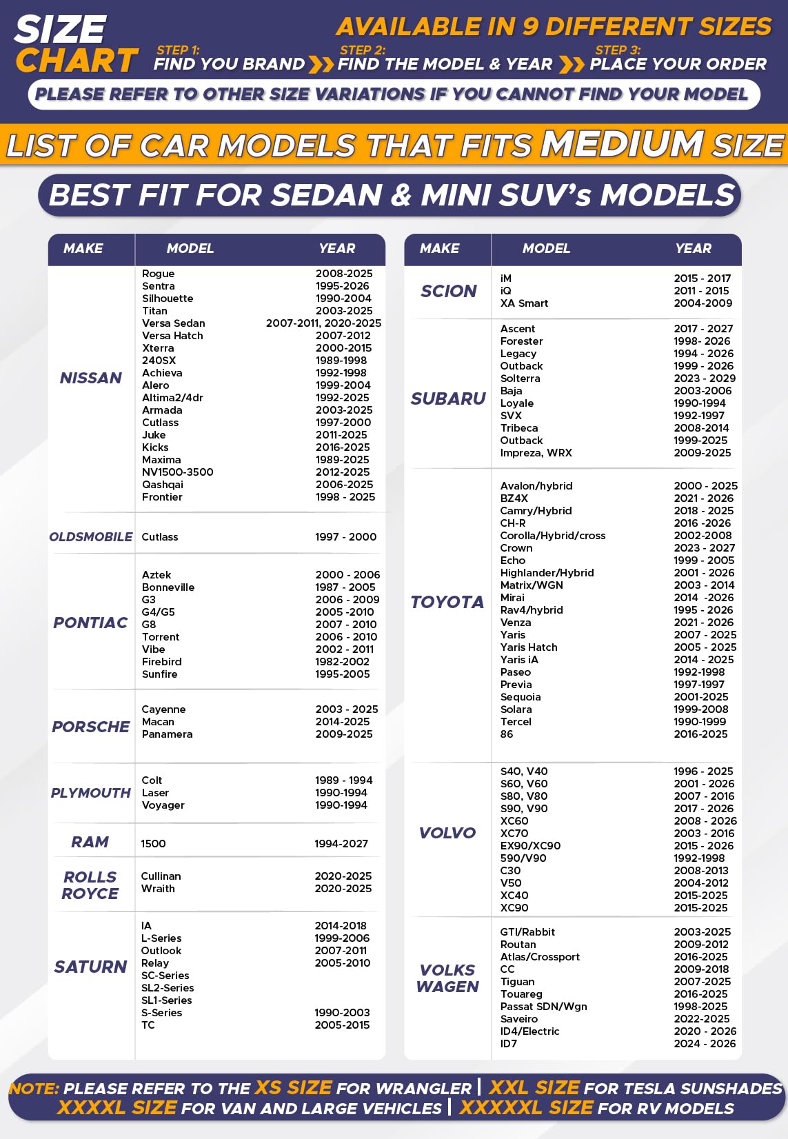 Q: How can I choose the right fit for my vehicle?A: To choose the right fit, refer to the size chart provided with the EcoNour Windshield Sun Shade. It's available in multiple sizes to cater to various vehicle models, ensuring maximum protection for your car's windshield.