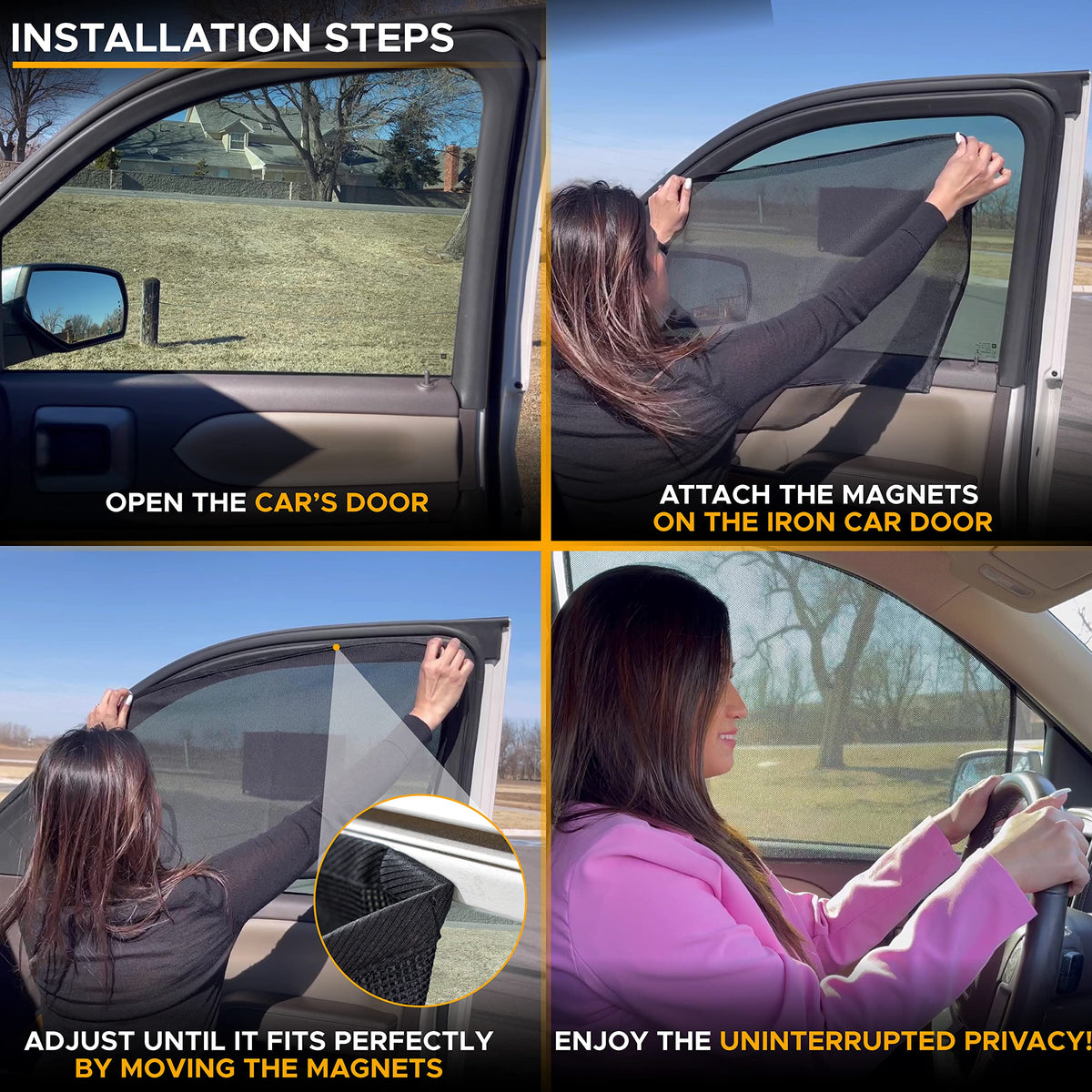 Car window shades for side windows is made of protective mesh which makes the interior of the car cooler! Keeps your driving more comfortable and also protects your car interior from aging. No more glare, No more heat. Can still see through the windows using our side magnetic sunshade. Have a safe drive. The Side Magnetic Sunshade will block the sunlight and ultraviolet rays. A lightweight magnetic window screen can effectively protect your skin from the blazing sun. EcoNour Side Window Shades are suitable for most cars. Please make sure that your cars side window frame is a metal window frame before purchasing. Our Car Window Shades can be installed in metal doors or metal window frames with the help of magnets.