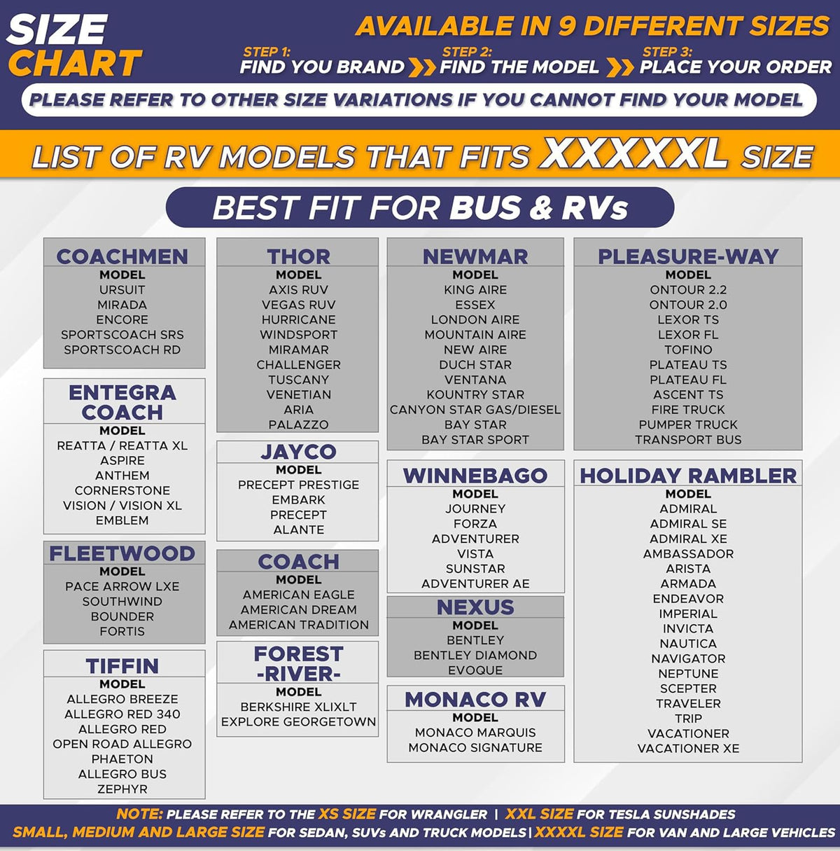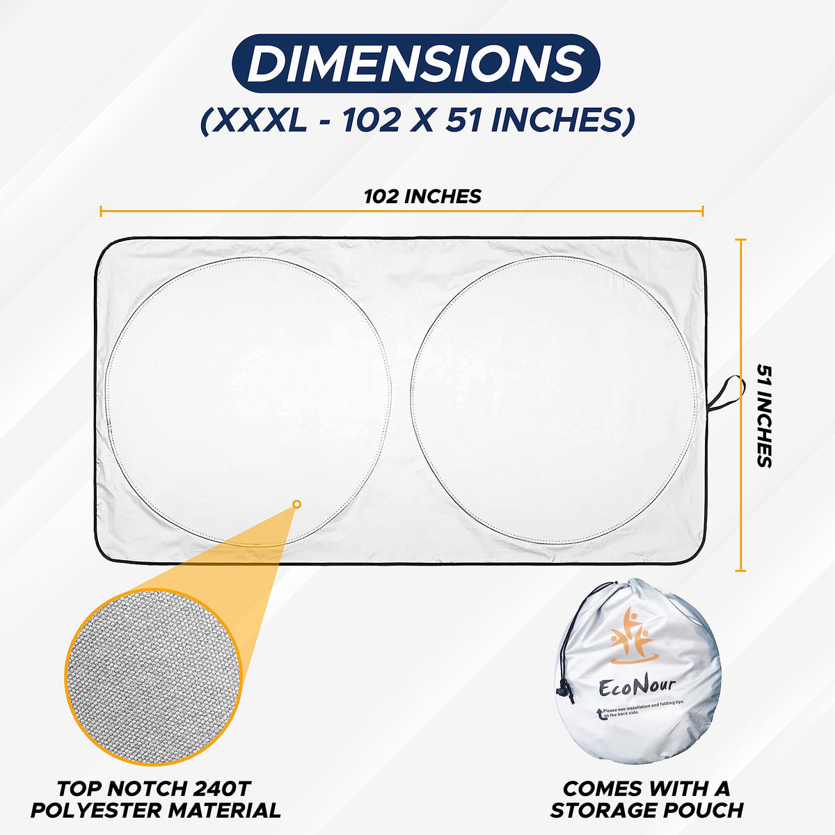 Q: What size RVs does the EcoNour RV Windshield Sunshade fit?A: The EcoNour RV Windshield Sunshade is designed to fit XXXL size RVs, with dimensions of 102 x 51 inches, making it suitable for larger RVs, trucks, motorhomes, and buses.