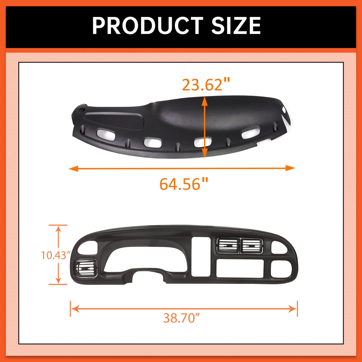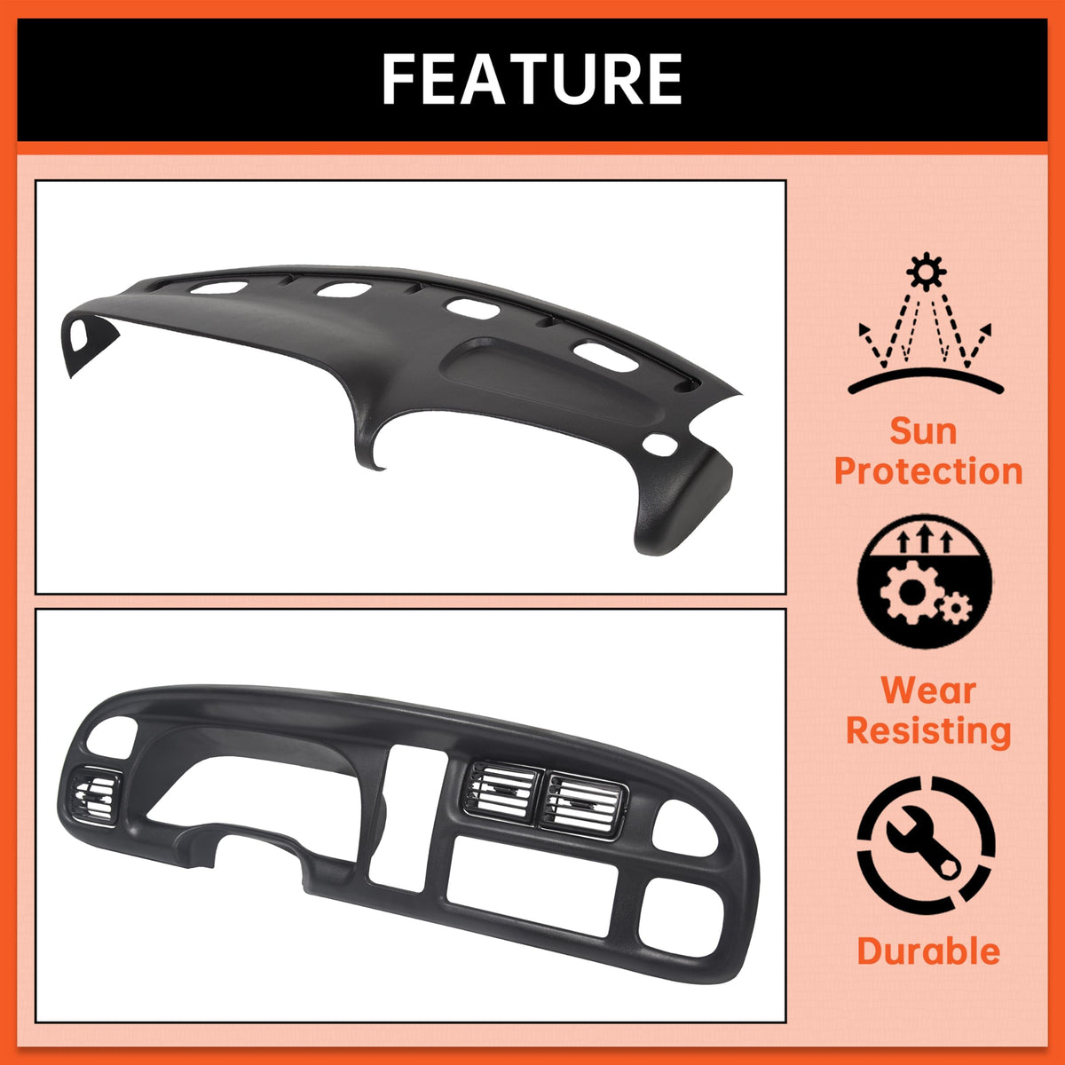 Fitment: Compatible with 1998-2001 Dodge Ram 1500 Truck 2-1/2'' Lip; Compatible with 1998-2002 Dodge Ram 2500 Truck 2-1/2'' Lip; Compatible with 1998-2002 Dodge Ram 3500 Truck 2-1/2'' Lip Dash Board Bezel Replacement: A sturdy design is not easily deformed or damaged. Include clips and vents. Direct replacement, without drilling or modification. The installation consists of 8 clips, including vents Dashboard Overlay Cover: Made of durable ABS plastic, it is not easy to fade, protecting your dashboard from the sun and helping to reduce the glare of the windshield Installation: Simple installation. Professional installation is highly recommended. NOTE: This Dash Board Bezel is a complete replacement part, it is not a cover. Dashboard Overlay Cover is Not as a replacement part Packages: 1 x Dashboard Cover and 1 x Dashboard Bezel Replacement with Vents. You will receive two packages