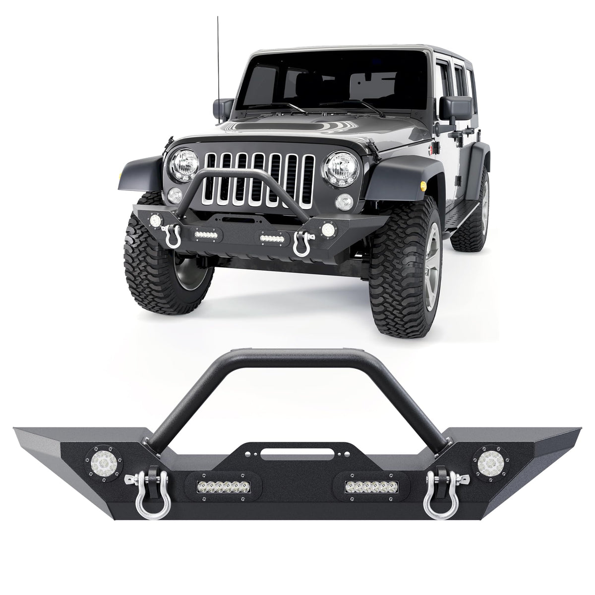 Update the look and capability of your Jeep Wrangler JK with this high quality Penton bolt-on bumper. Compatible with 2007-2018 Jeep Wrangler JK; Compatible with 2018-2022 Wrangler JL & Unlimited JLU; Compatible with 2020-2022 Gladiator JT all models. Dose not Compatible with 2017 JK Rubicon Recon model. The front bumper with LED fog light compatibility are a perfect upgrade for those looking for increased protection while keeping fog light function and style. 1/4'' thick custom mounting brackets. Ultra-Rugged, one-piece fully welded design for extra strength. Durable steel construction - 2'' x .120'' wall 72lbs.Bumper size 56'' width x 7.5'' depth.Winch plate size 24'' x 7.5''. Powder-coated textured black. Packing List: 1 x Front Bumper, 2 x 18w CREE LED Fog Lights, 2 x 2w CREE LED Work Lights, 2 x 4.75ton D-ring isolator for free. Include all harnesses in the picture. Not include extension connector wires. Update the look and capability of your Jeep Wrangler JK with this high quality bolt-on bumper.